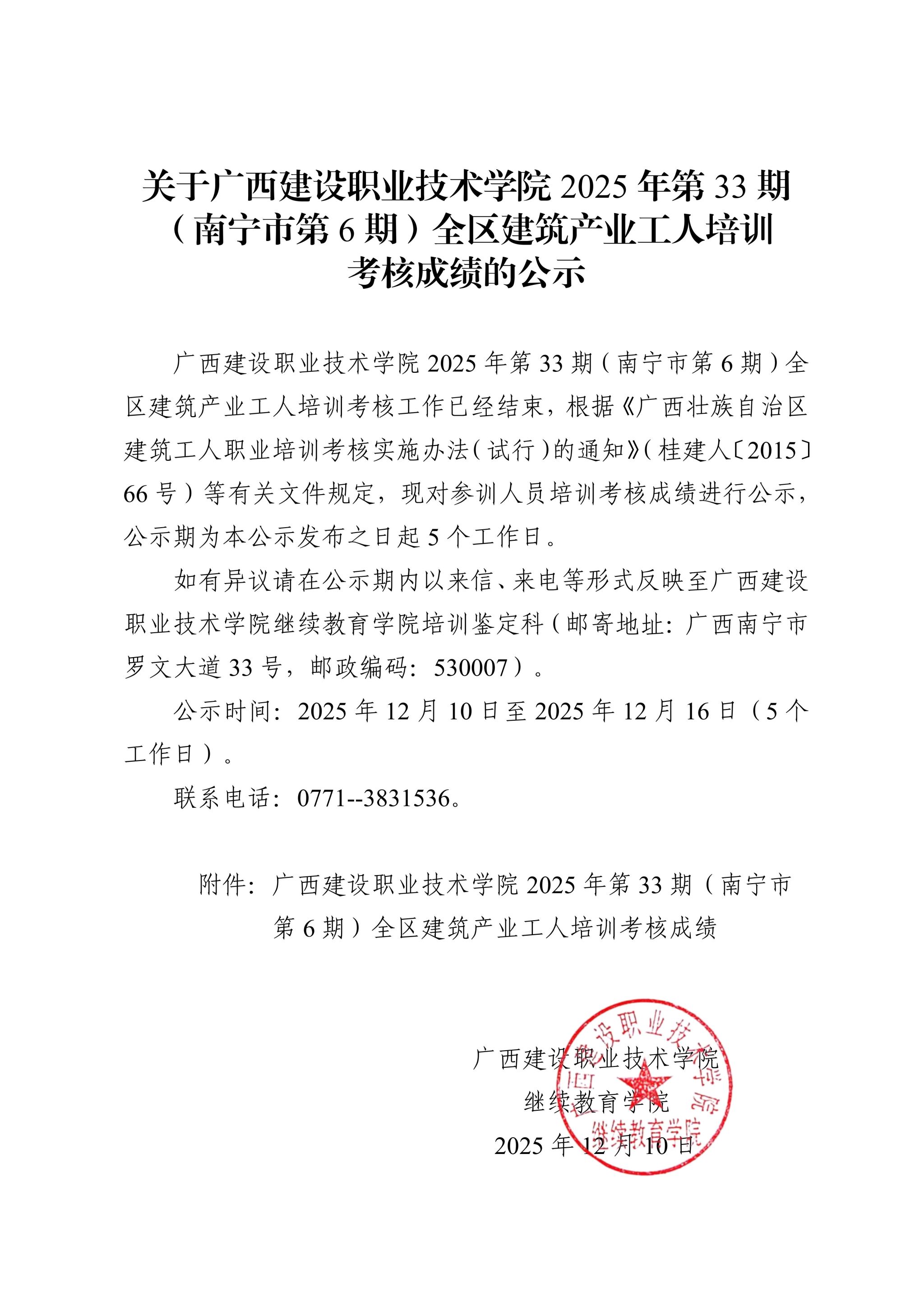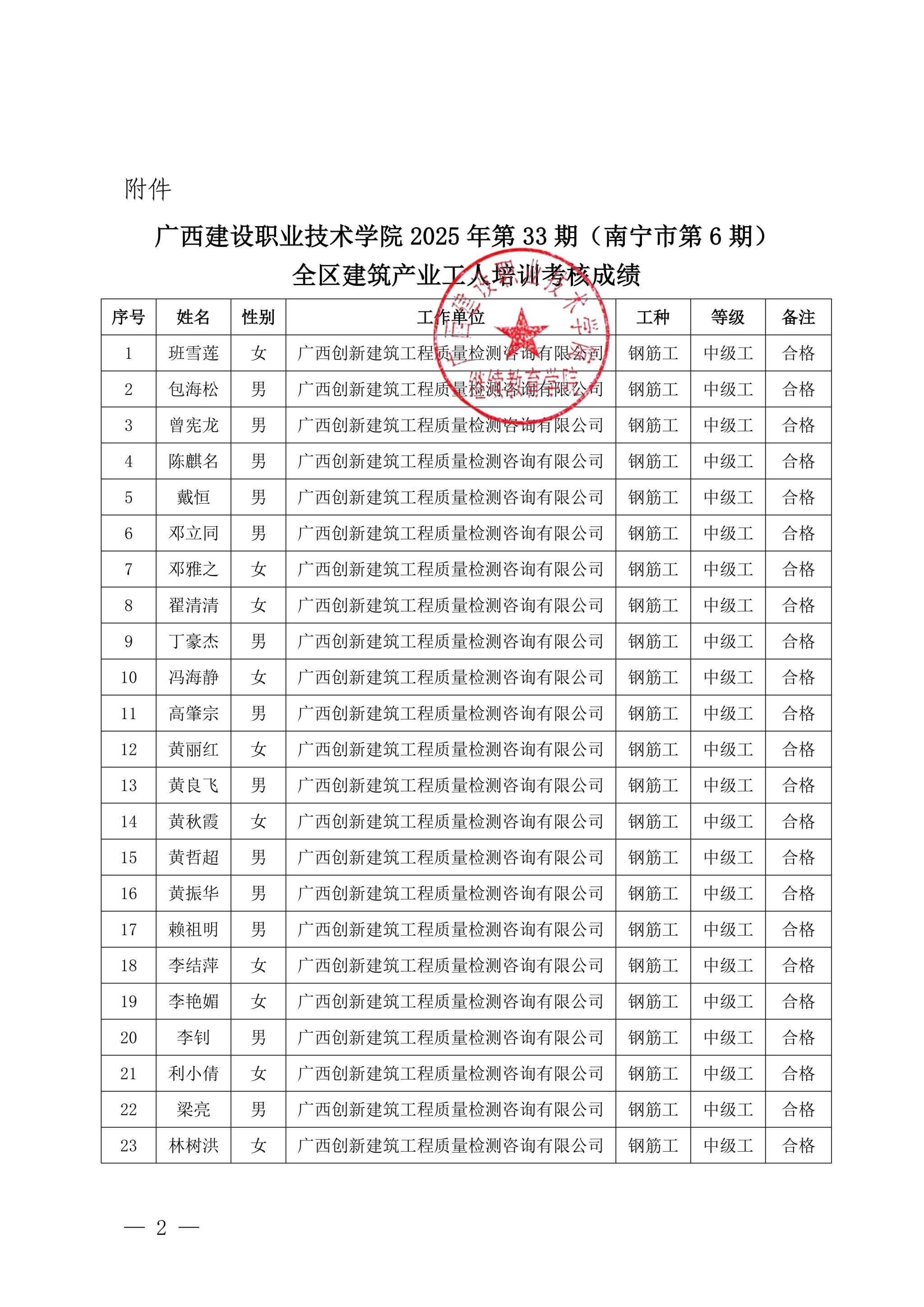 关于伟德国际1946源于英国2025年第33期(南宁市第6期)全区建筑产业工人培训考核成绩的公示