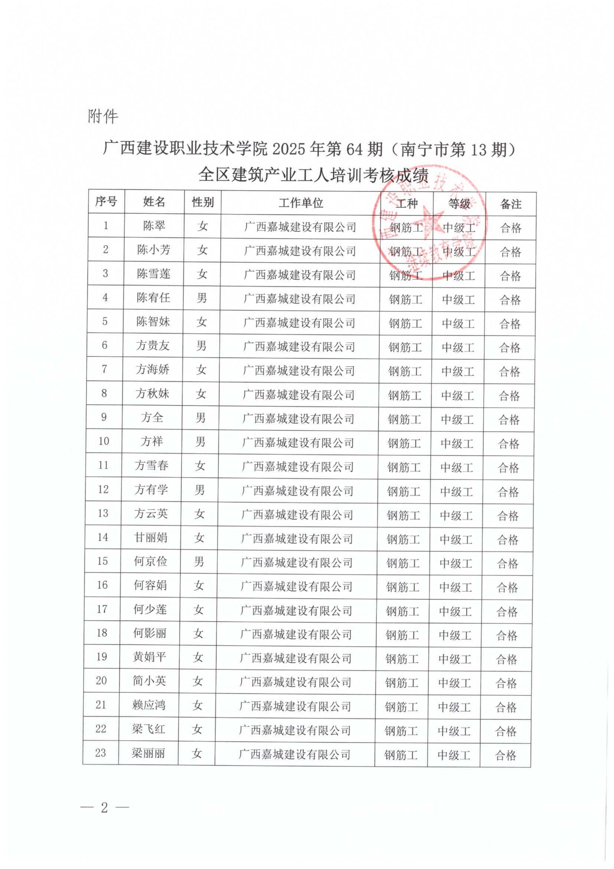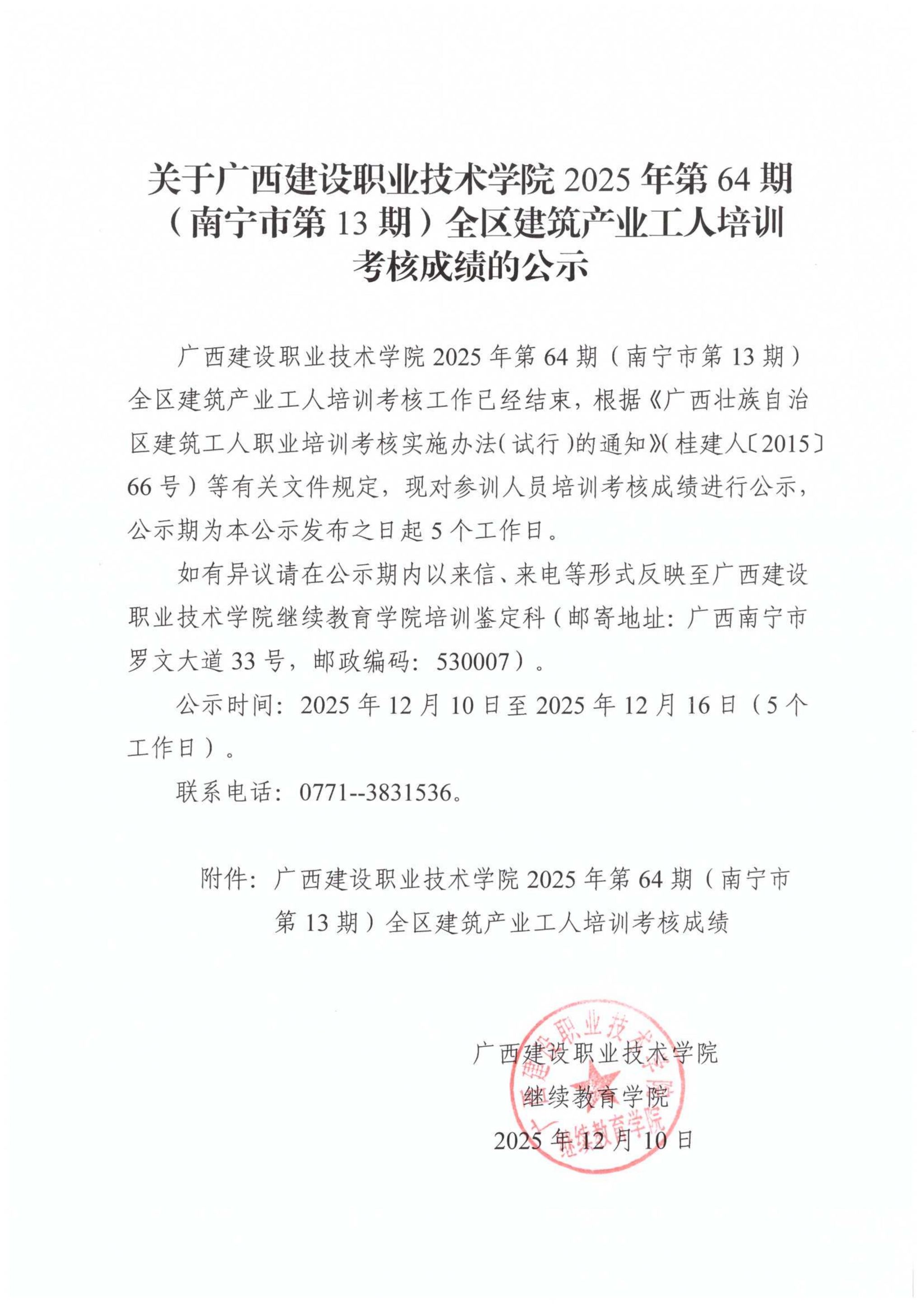 关于伟德国际1946源于英国2025年第64期(南宁市第13期)全区建筑产业工人培训考核成绩的公示
