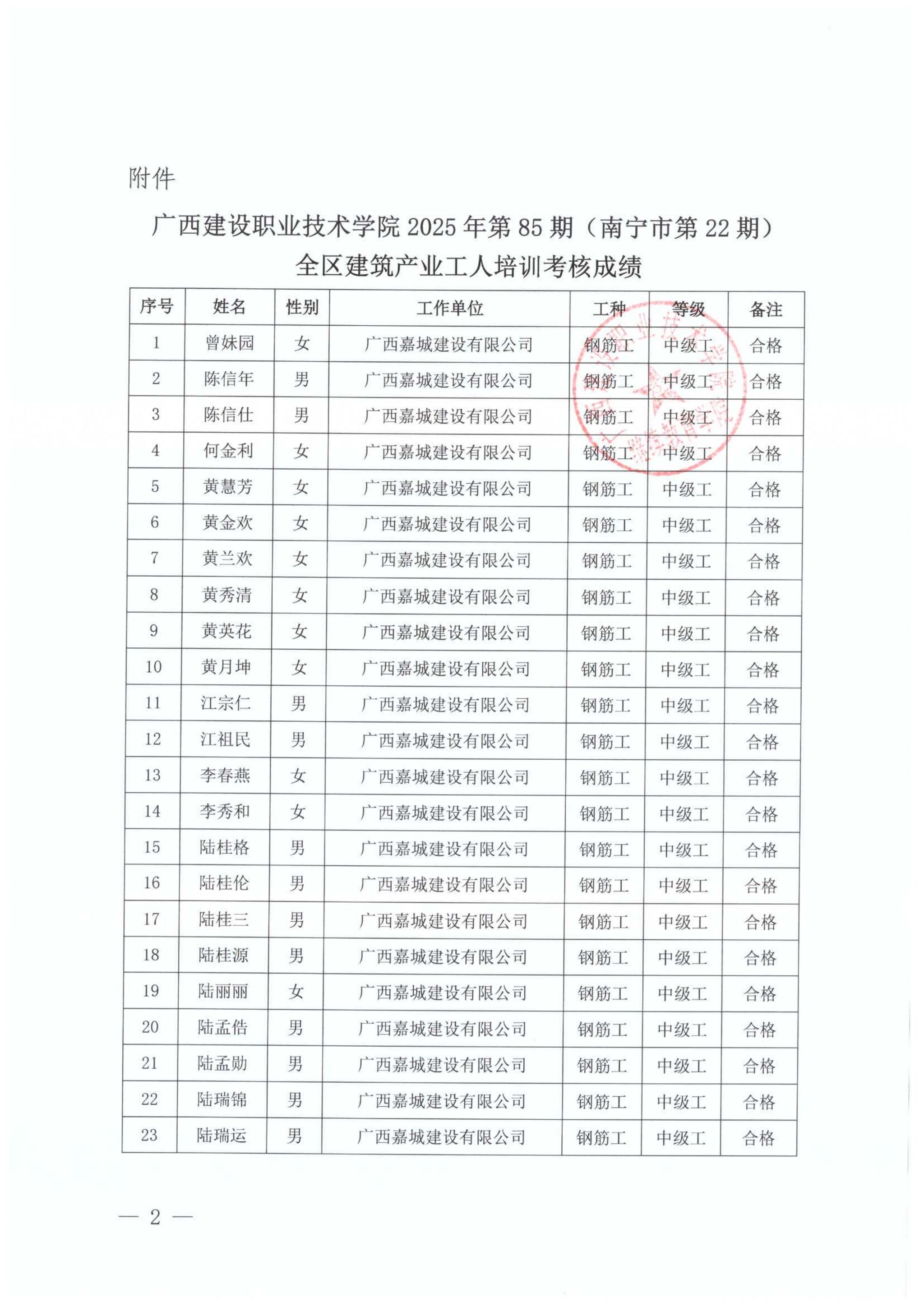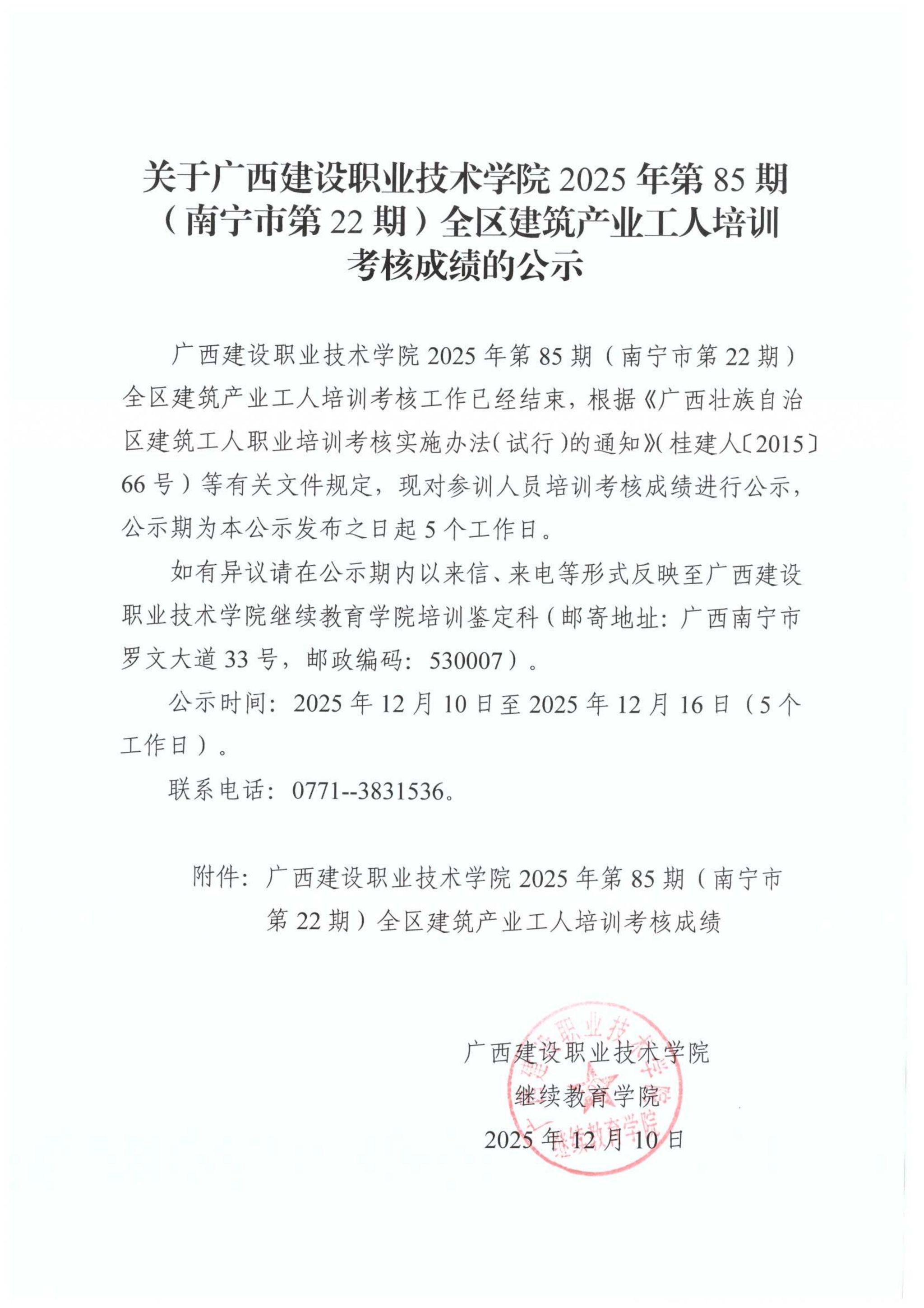 关于伟德国际1946源于英国2025年第85期(南宁市第22期)全区建筑产业工人培训考核成绩的公示