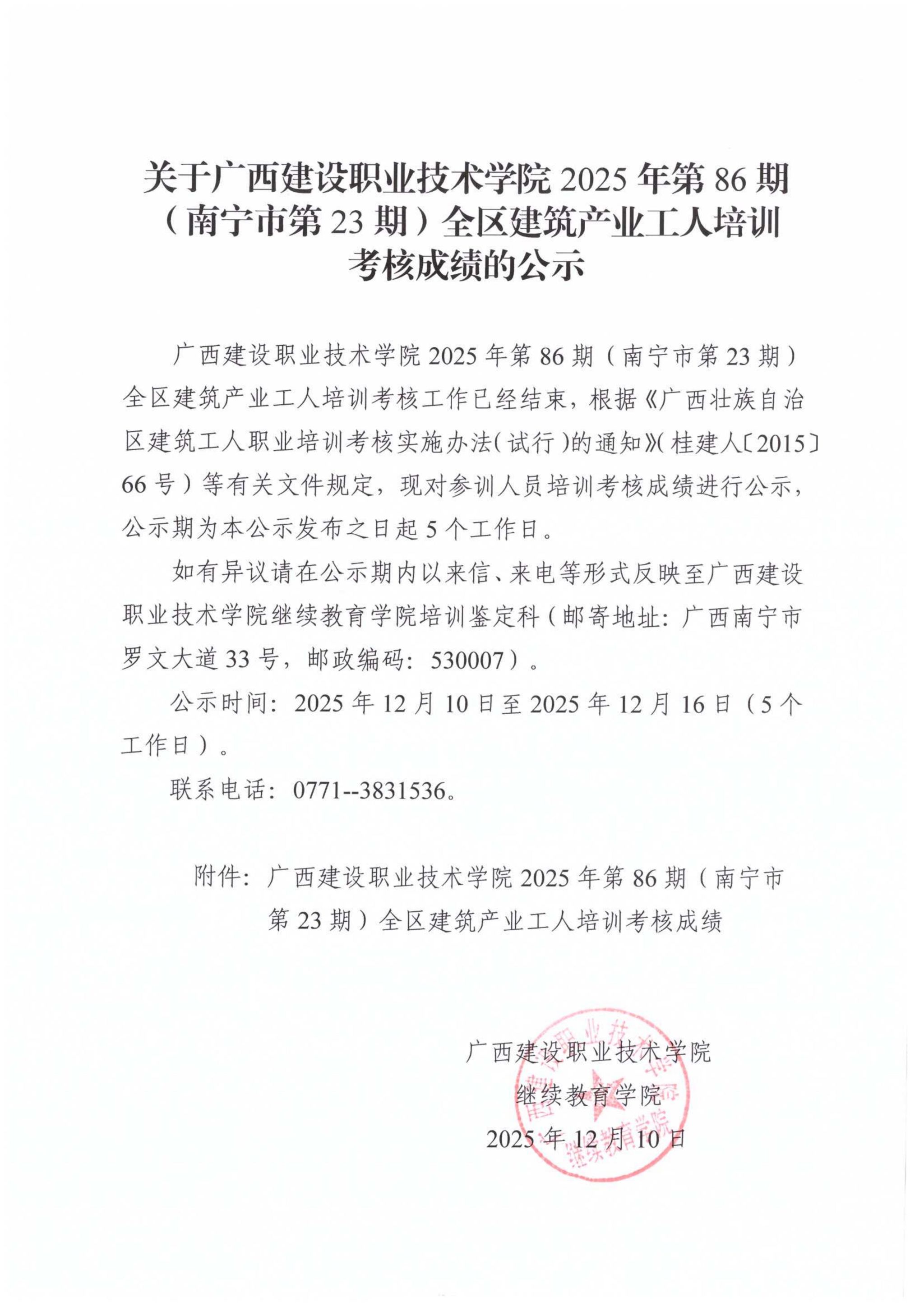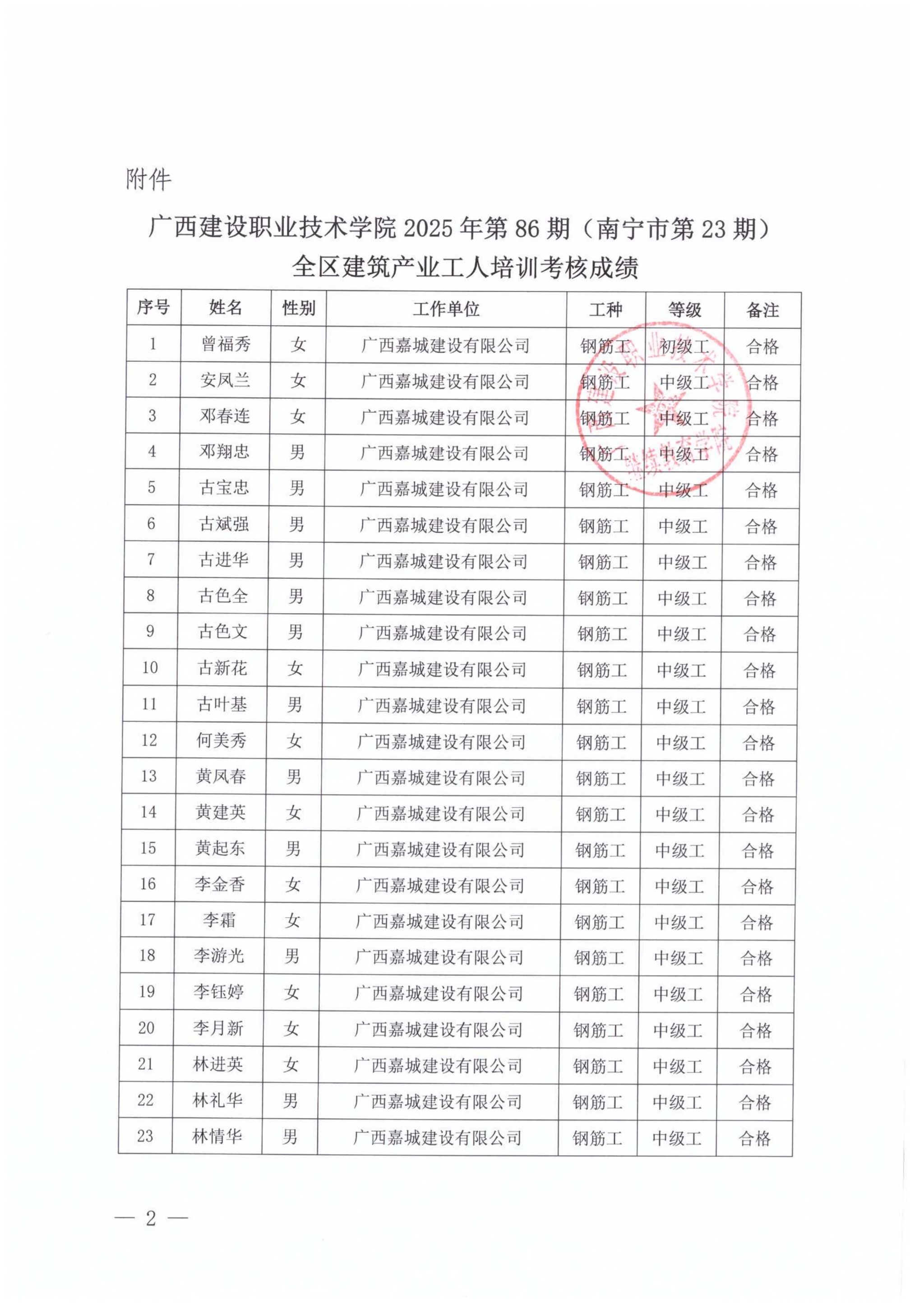 关于伟德国际1946源于英国2025年第86期(南宁市第23期)全区建筑产业工人培训考核成绩的公示