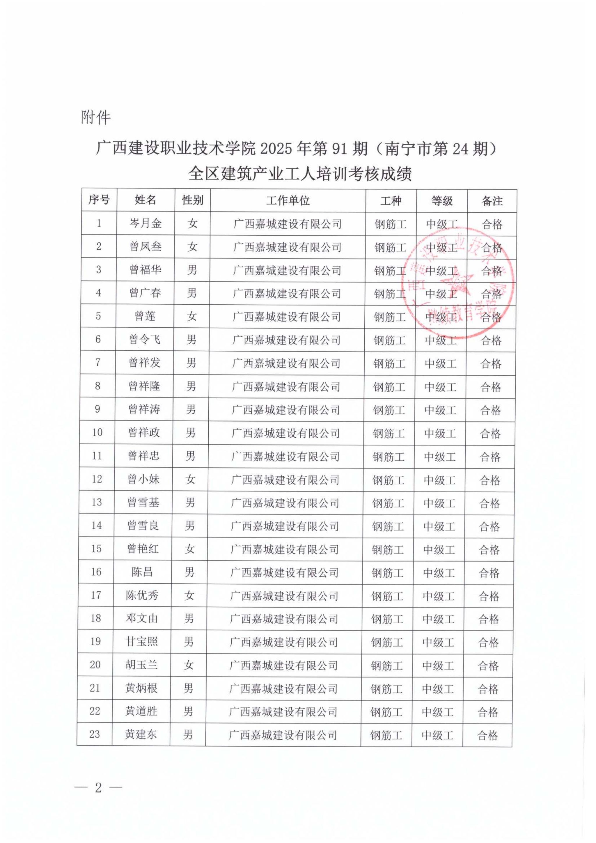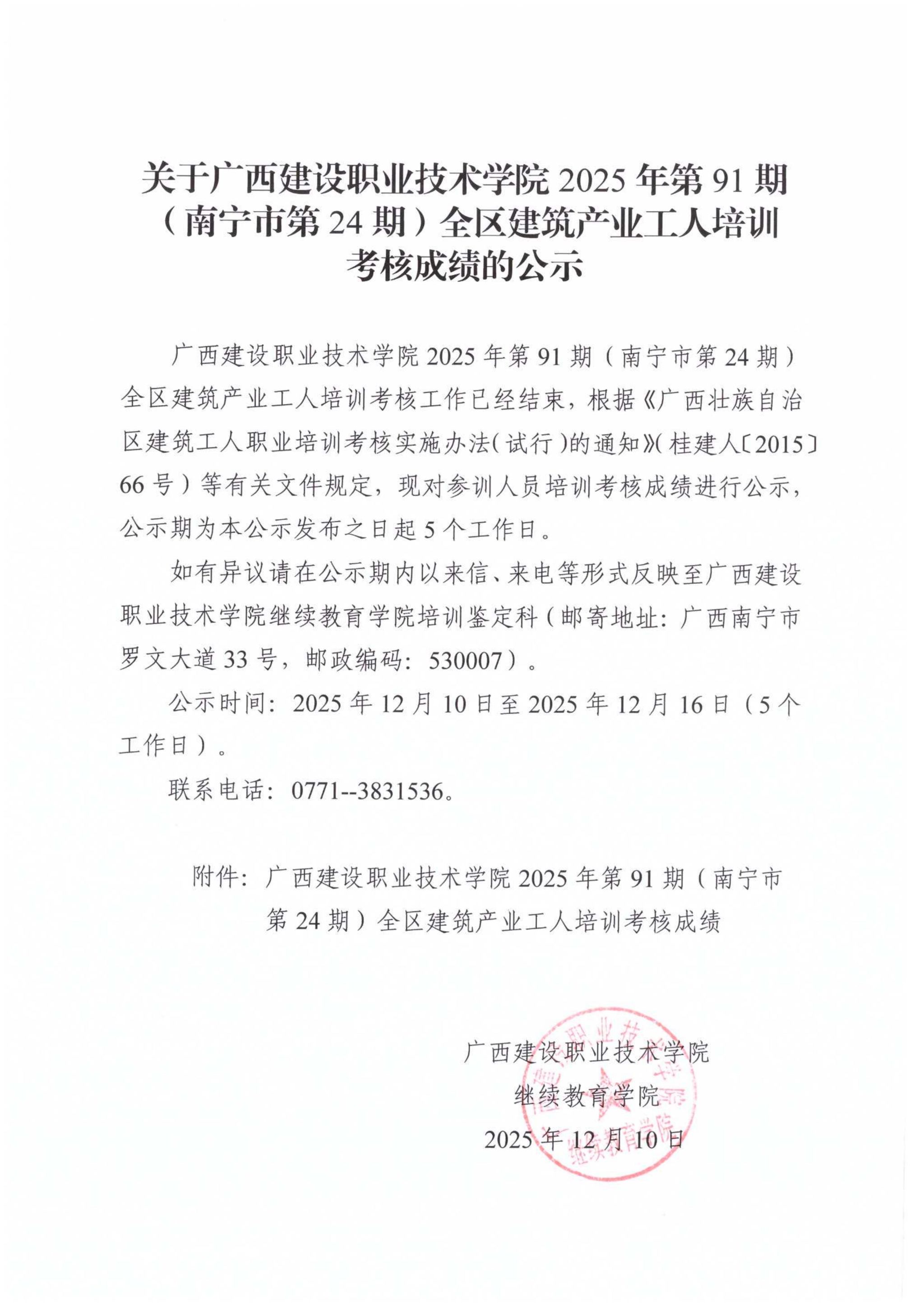 关于伟德国际1946源于英国2025年第91期(南宁市第24期)全区建筑产业工人培训考核成绩的公示