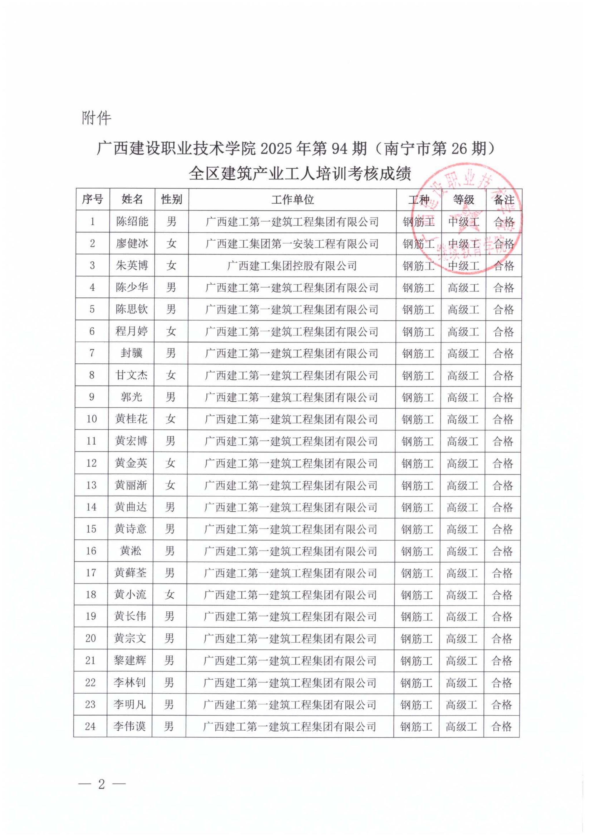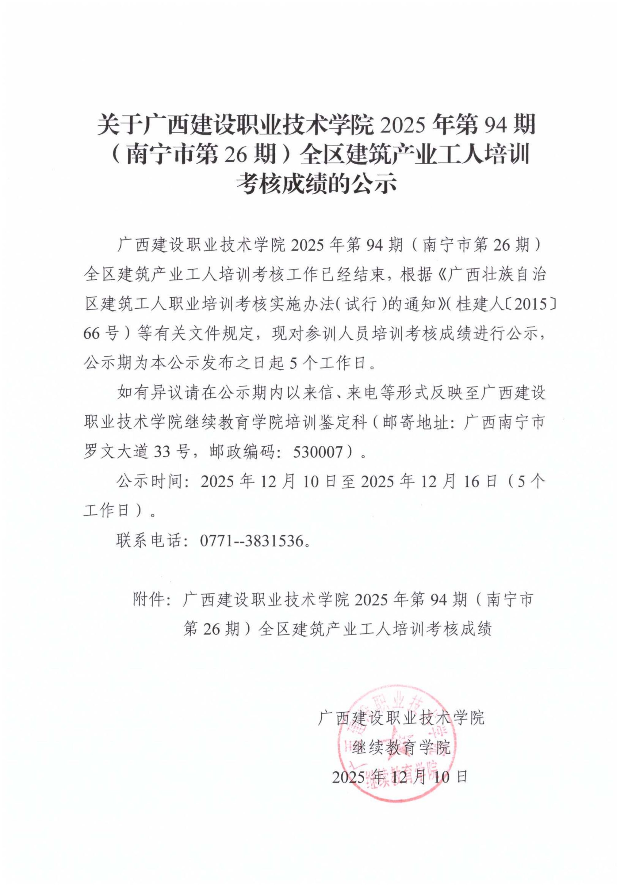 关于伟德国际1946源于英国2025年第94期(南宁市第26期)全区建筑产业工人培训考核成绩的公示
