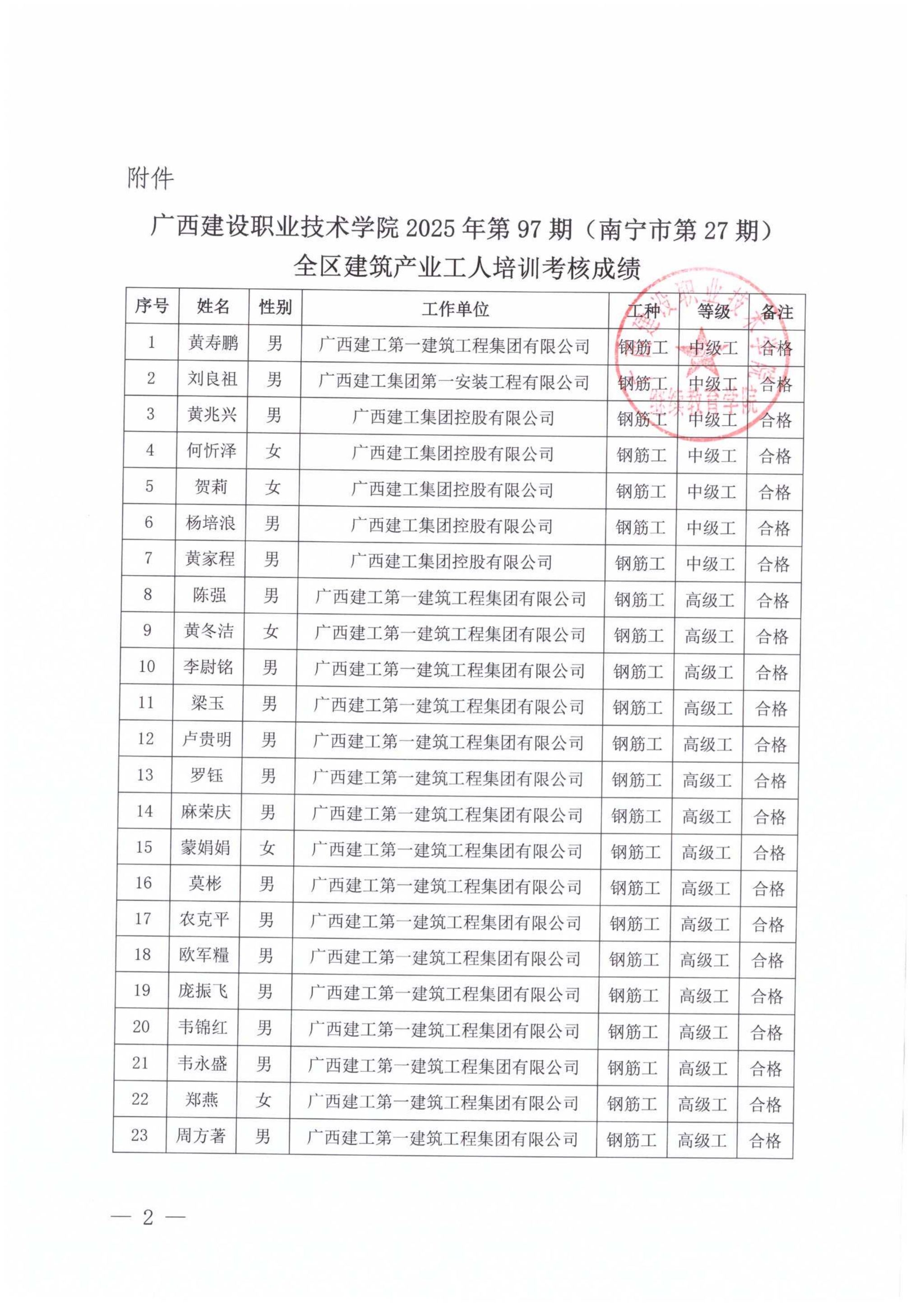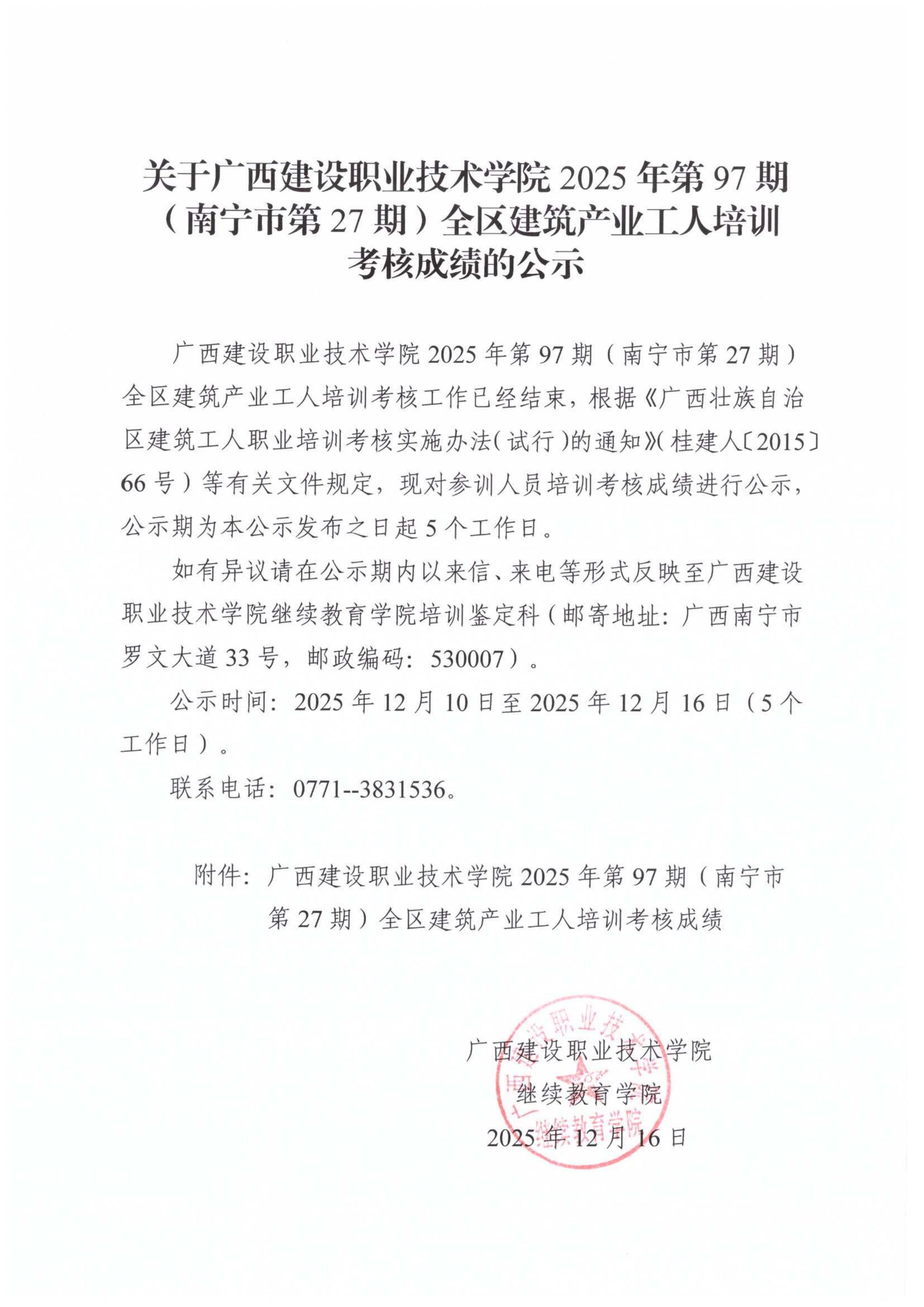 关于伟德国际1946源于英国2025年第97期(南宁市第27期)全区建筑产业工人培训考核成绩的公示