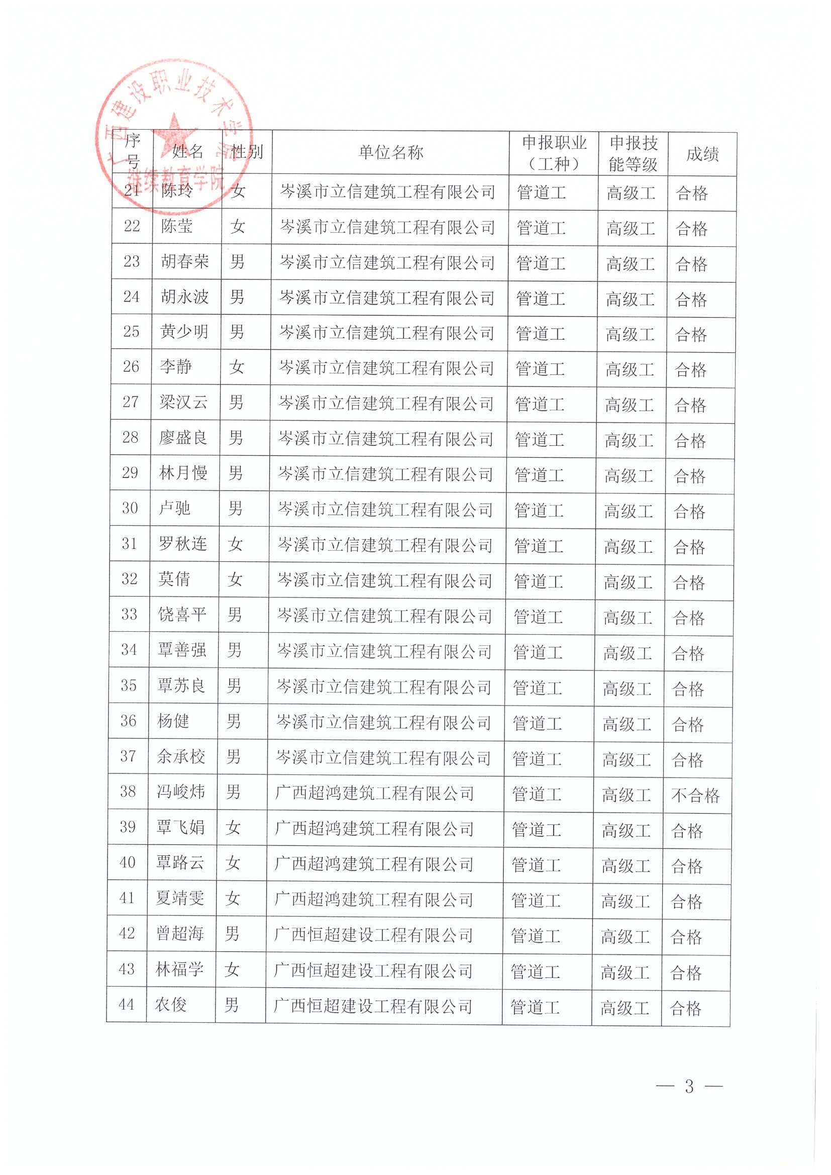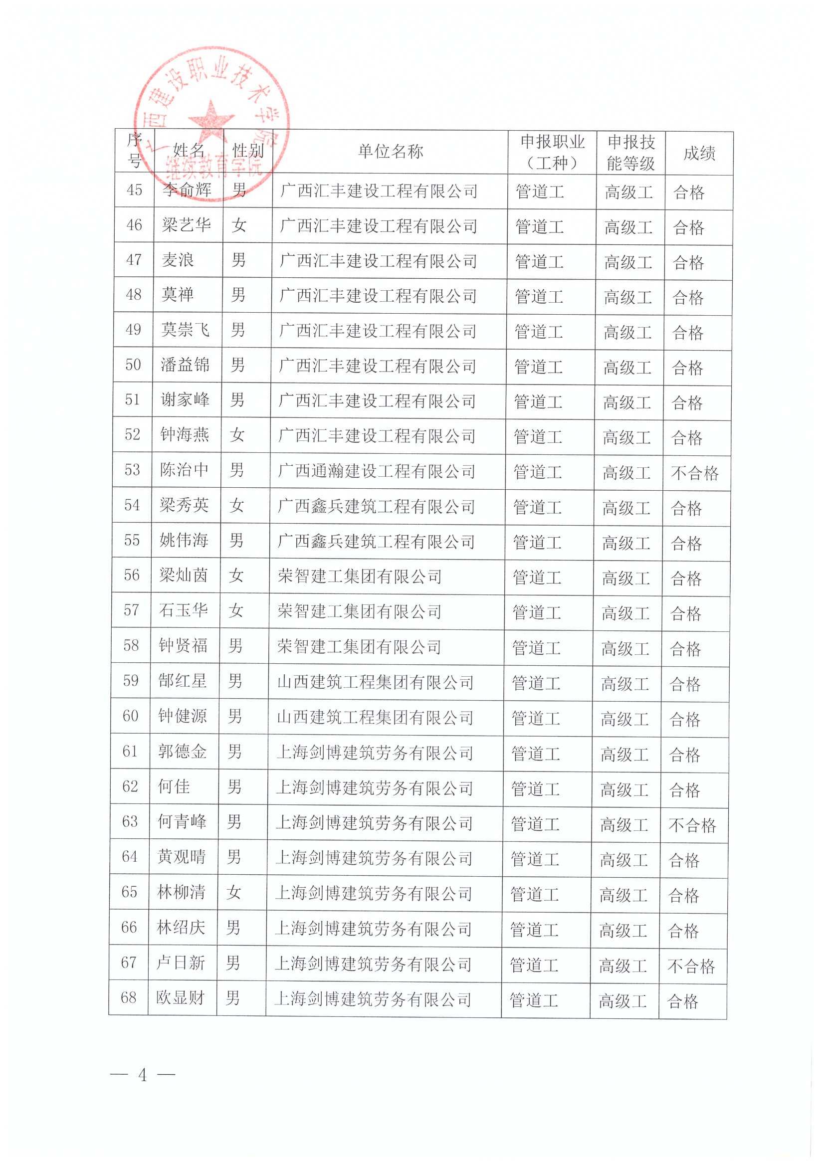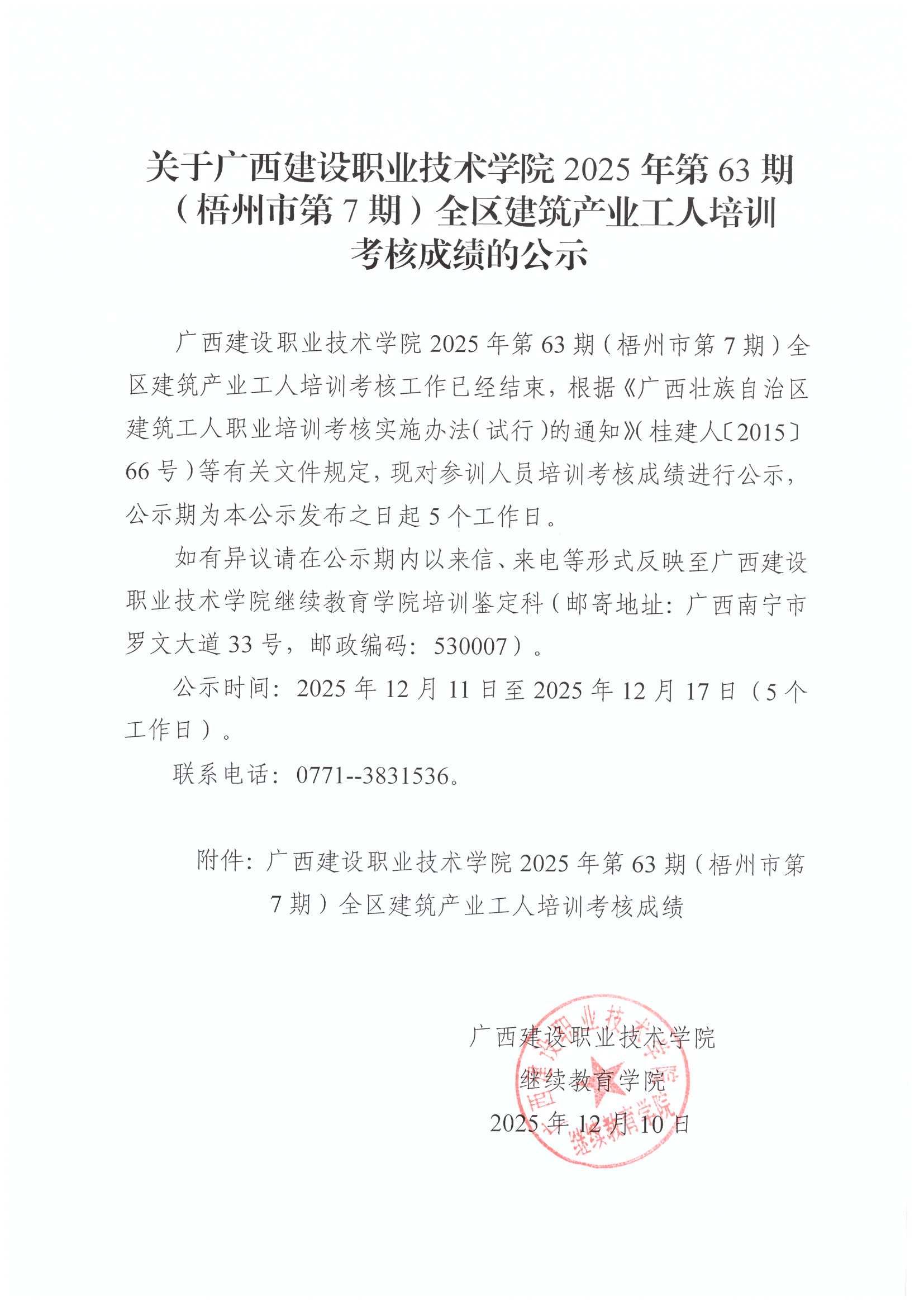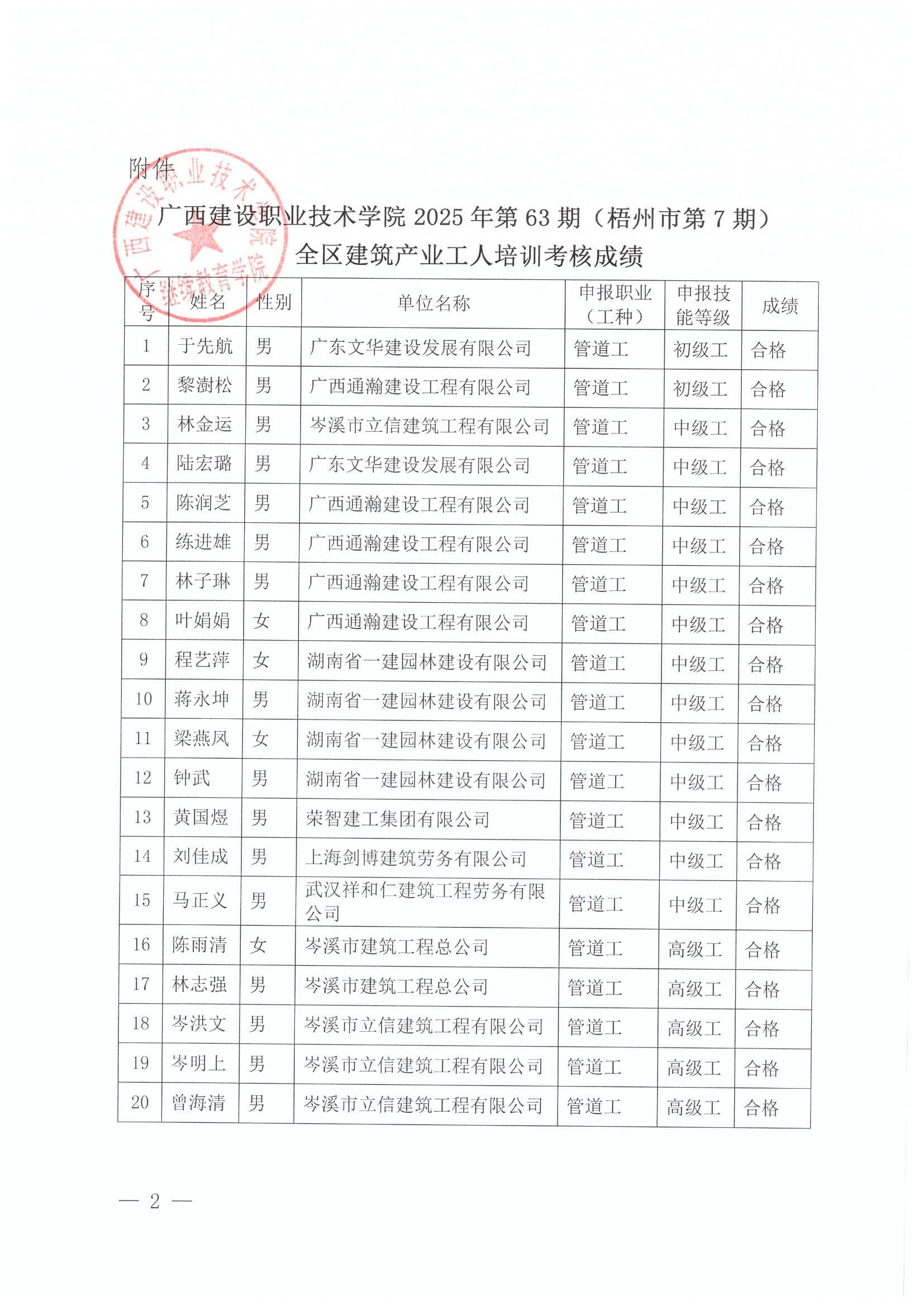 关于伟德国际1946源于英国2025年全区建筑产业工人第63期(梧州市第7期)培训考核成绩的公示