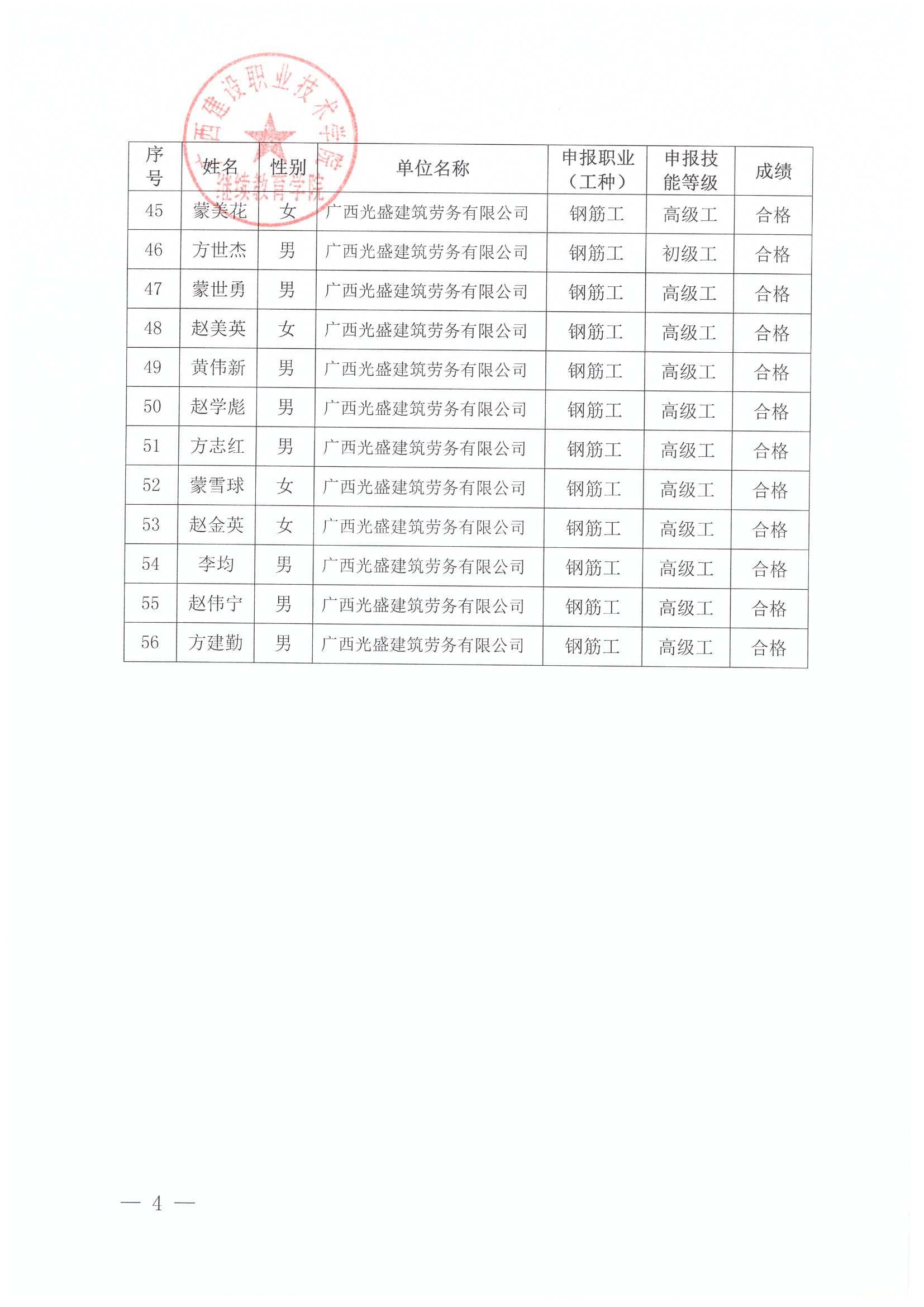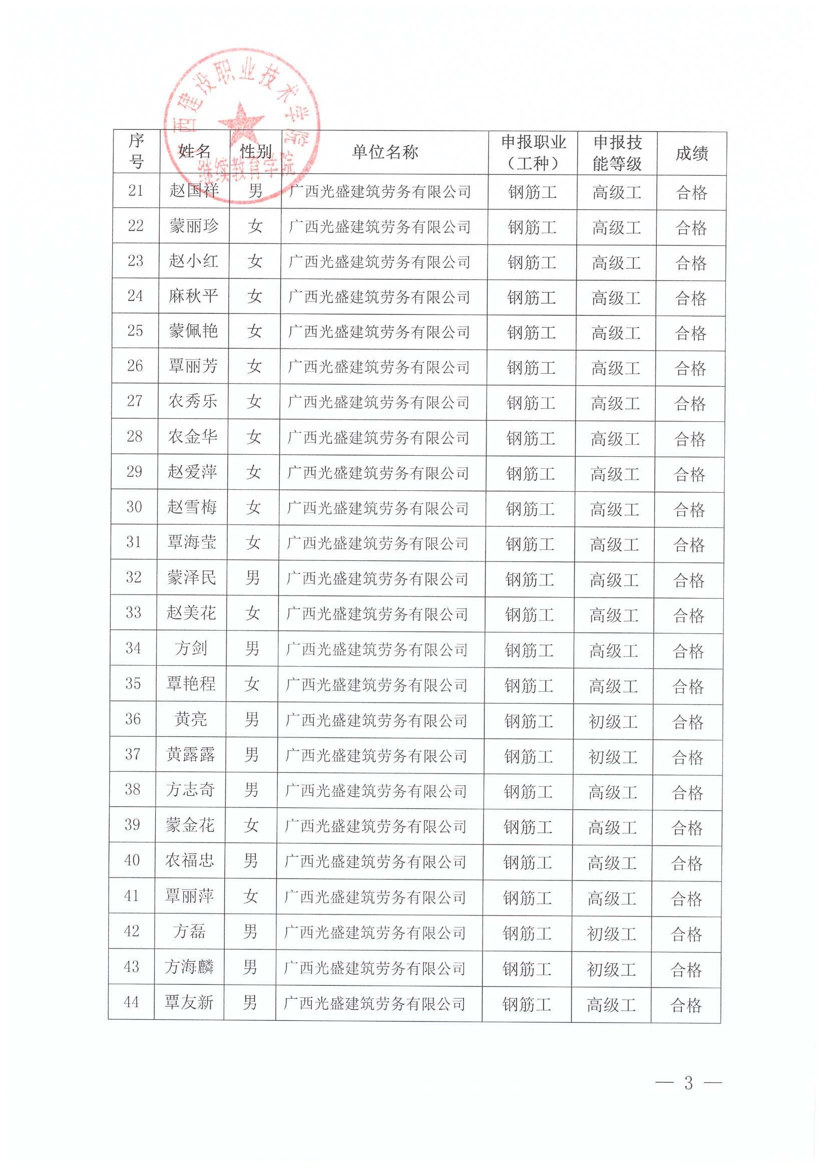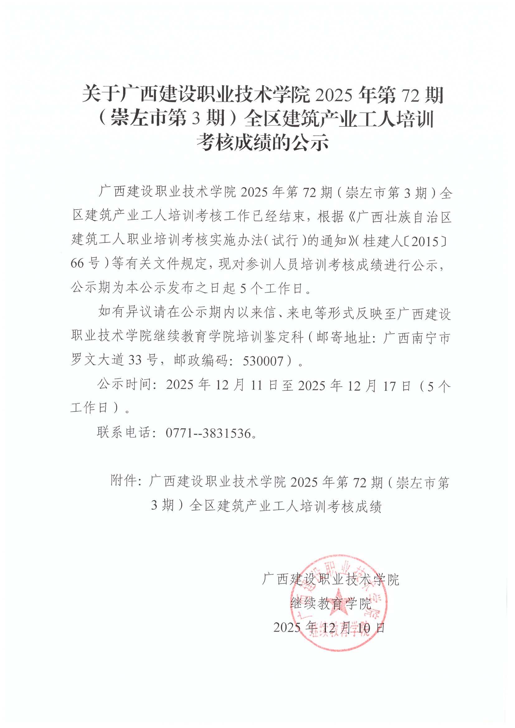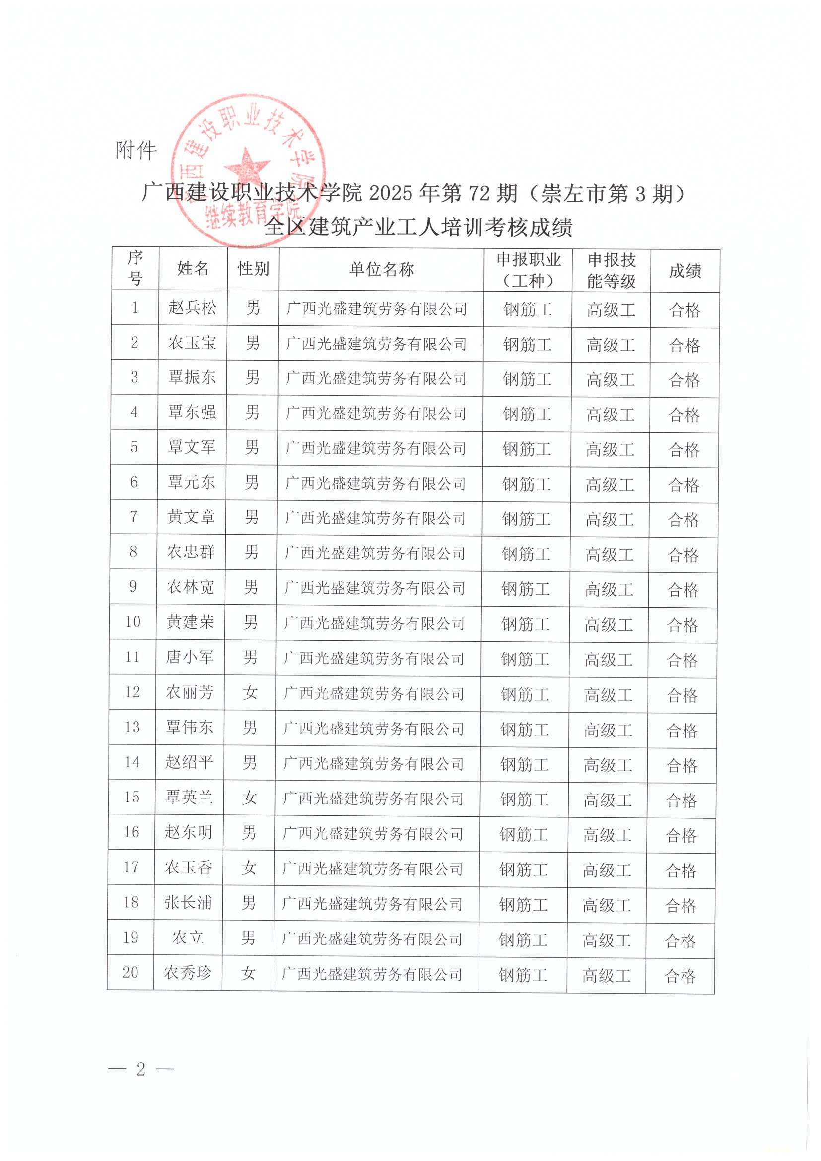 关于伟德国际1946源于英国2025年全区建筑产业工人第72期(崇左市第3期)培训考核成绩的公示