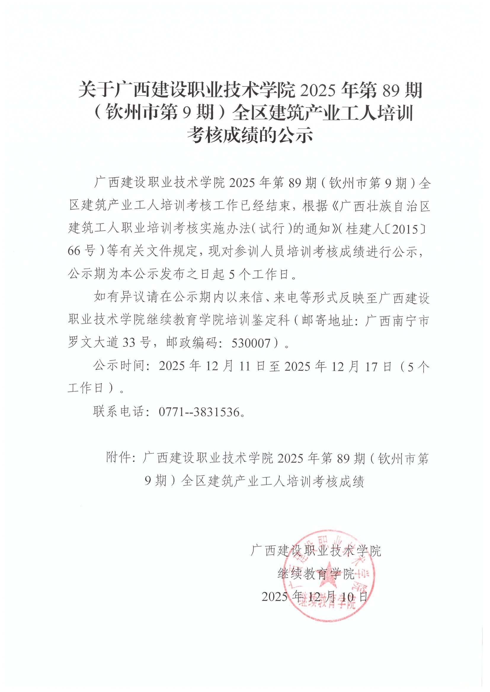 关于伟德国际1946源于英国2025年全区建筑产业工人第89期(钦州市第9期)培训考核成绩的公示