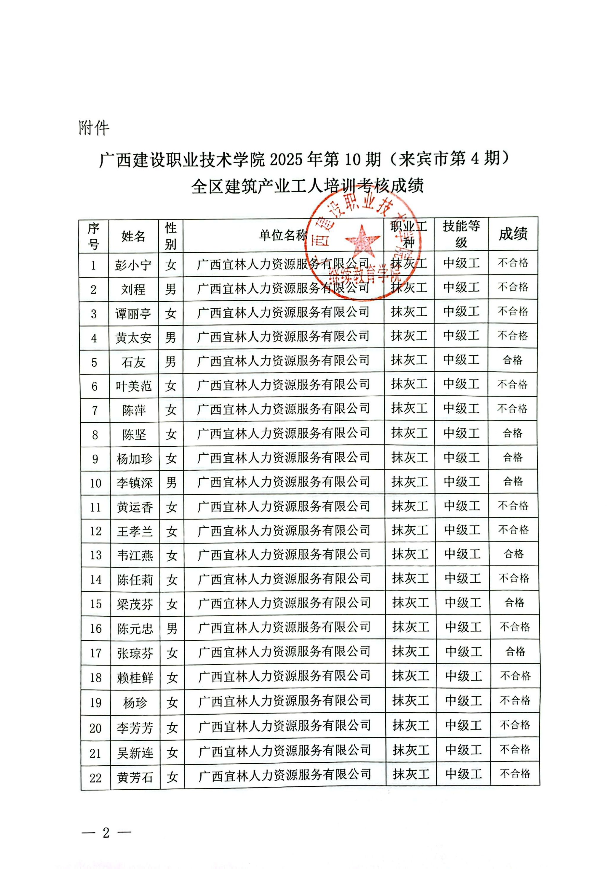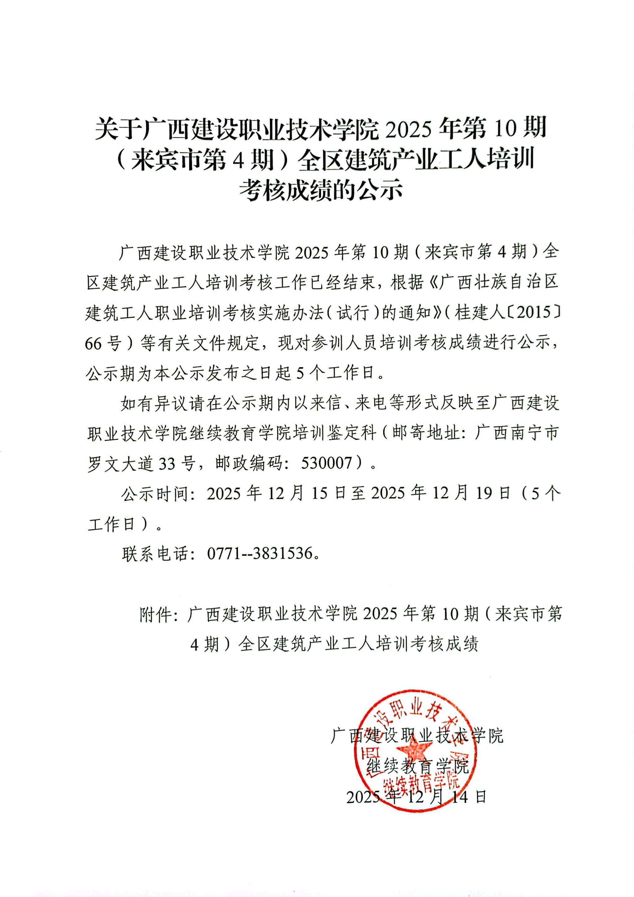 培训信息 当前位置: 首页 >> 培训信息 >> 正文 关于伟德国际1946源于英国2025年全区建筑产业工人第10期(来宾市第4期)培训考核成绩的公示 发布日期:2025-12-15 点击: 附件【关于伟德国际1946源于英国2025年全区建筑产业工人第6期(来宾市第3期)培训考核成绩的公示.pdf】已下载次