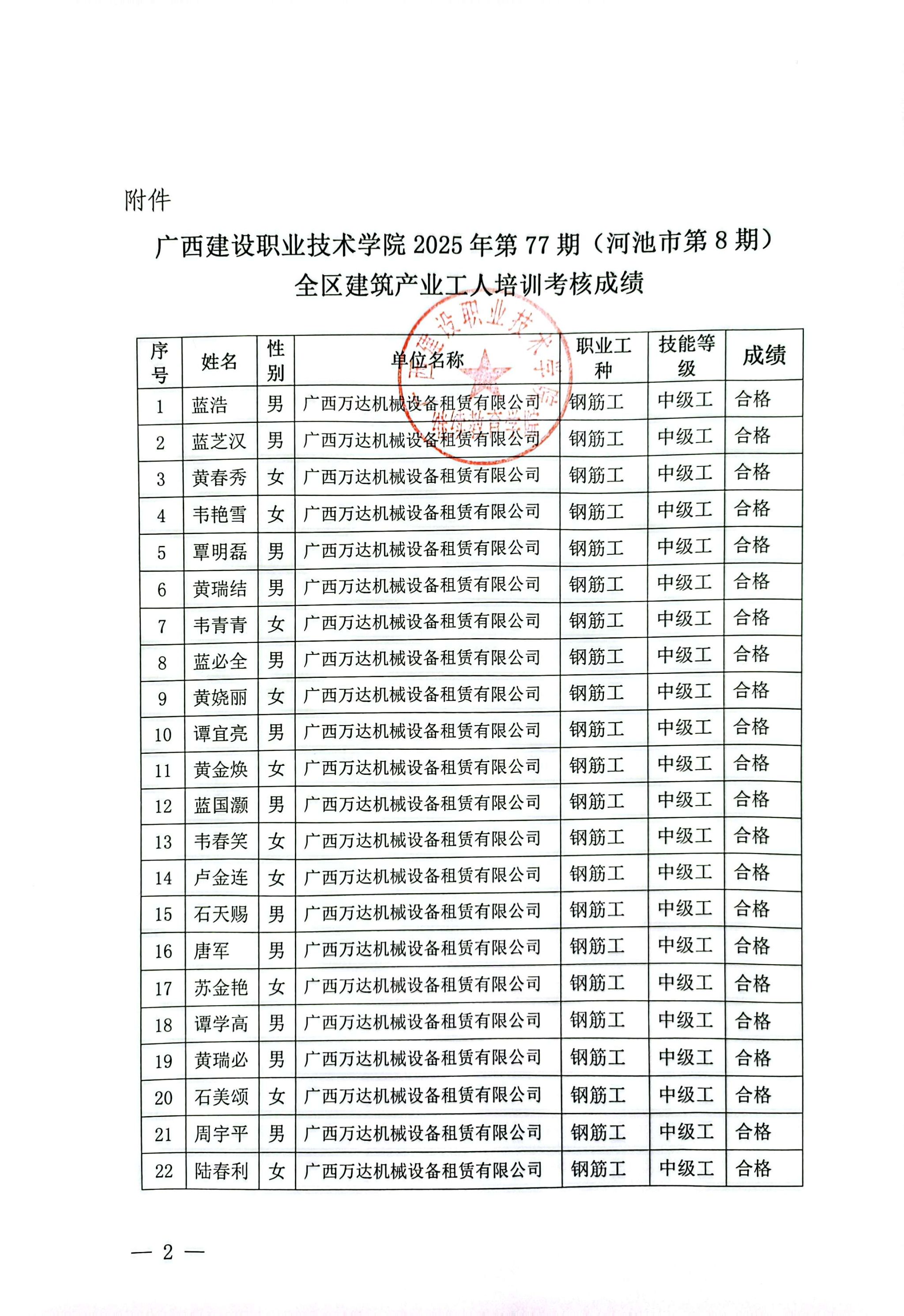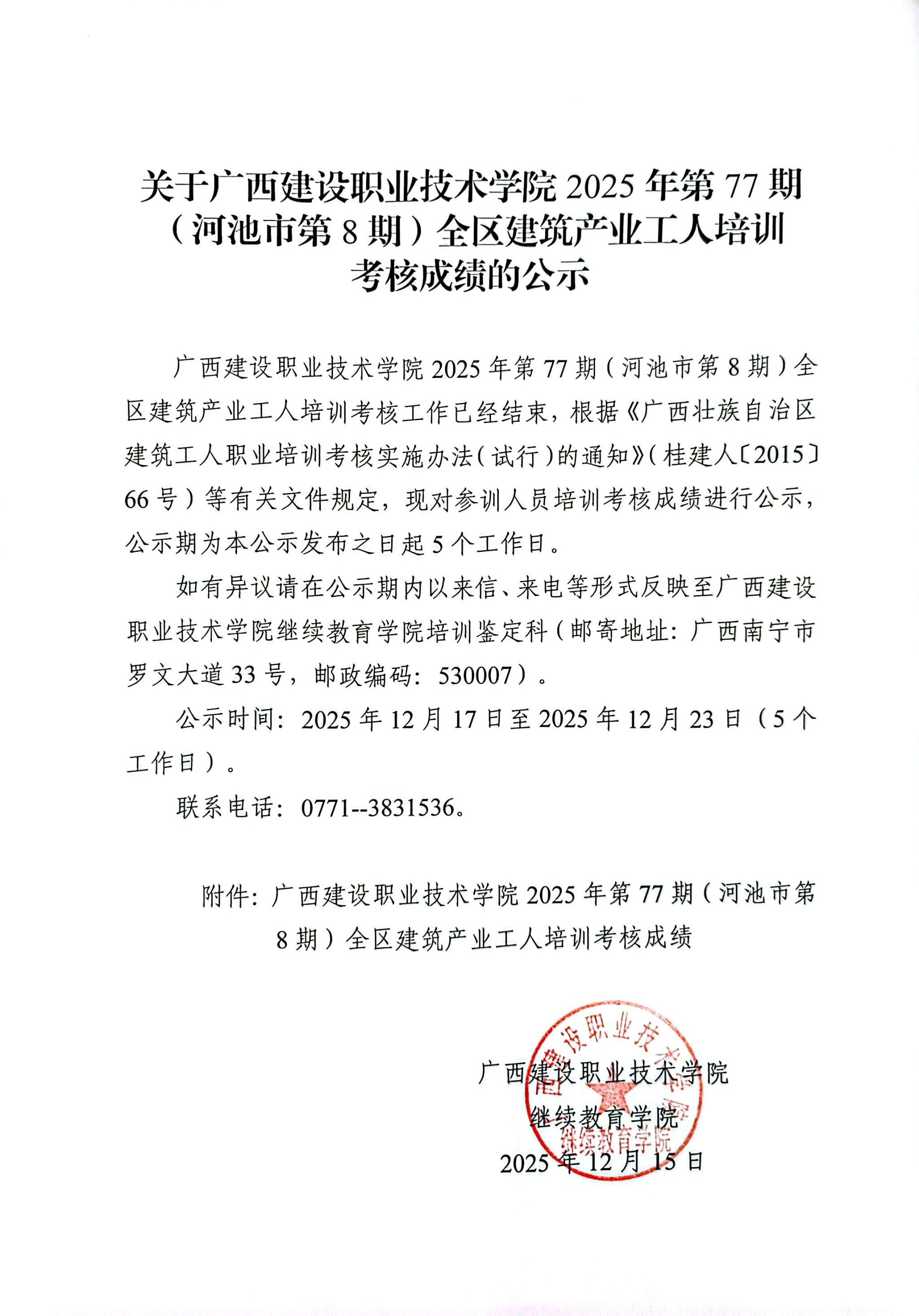 培训信息 当前位置: 首页 >> 培训信息 >> 正文 关于伟德国际1946源于英国2025年第77期(河池市第8期)全区建筑产业工人培训考核成绩的公示 发布日期:2025-12-18 点击: 附件【关于伟德国际1946源于英国2025年第77期(河池市第8期)全区建筑产业工人培训考核成绩的公示.pdf】已下载次