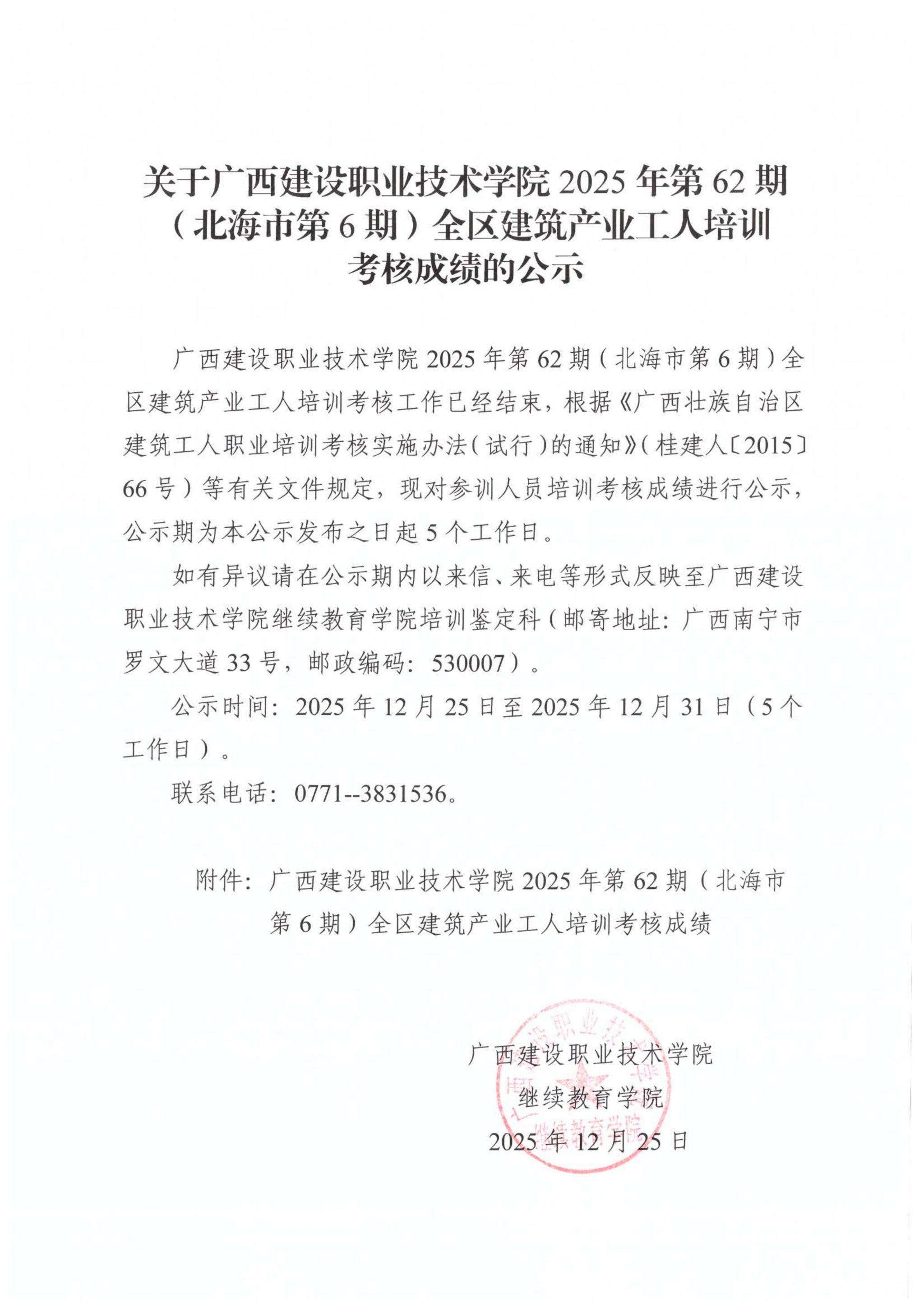 培训信息 当前位置: 首页 >> 培训信息 >> 正文 关于伟德国际1946源于英国2025年第62期(北海市第6期)全区建筑产业工人培训考核成绩的公示 发布日期:2025-12-25 点击: 附件【关于伟德国际1946源于英国2025年第62期(北海市第6期)全区建筑产业工人培训考核成绩的公示.pdf】已下载次