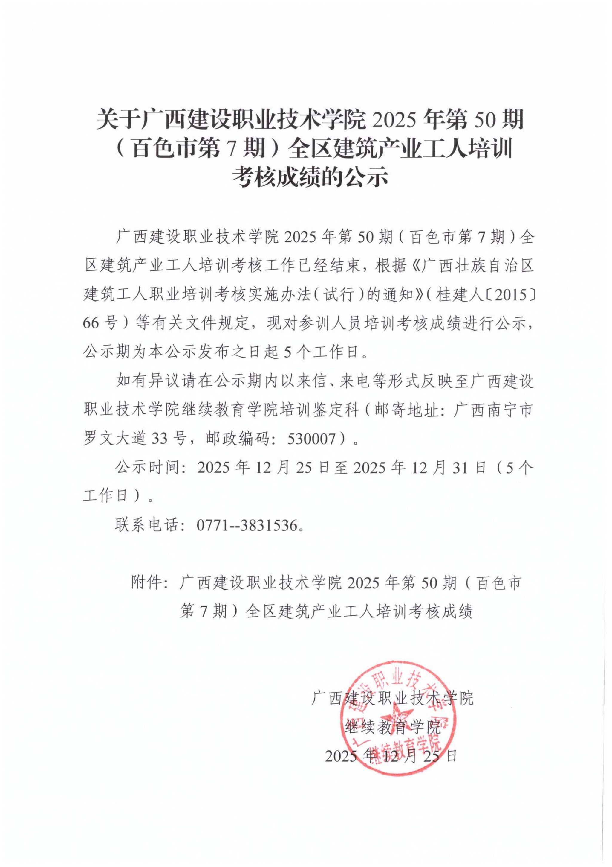 培训信息 当前位置: 首页 >> 培训信息 >> 正文 关于伟德国际1946源于英国2025年第50期(百色市第7期)全区建筑产业工人培训考核成绩的公示 发布日期:2025-12-26 点击: 附件【关于伟德国际1946源于英国2025年第50期(百色市第7期)全区建筑产业工人培训考核成绩的公示.pdf】已下载次