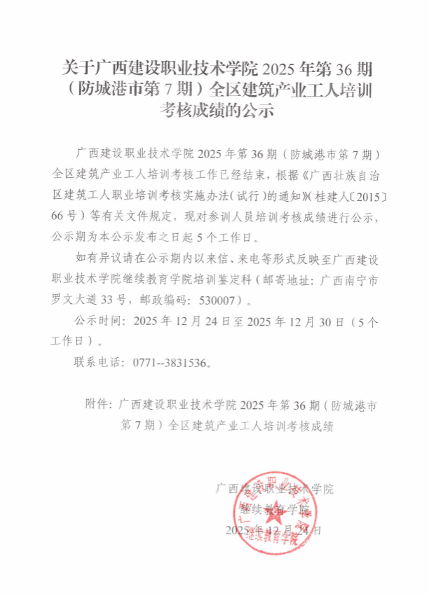 培训信息 当前位置: 首页 >> 培训信息 >> 正文 关于伟德国际1946源于英国2025年全区建筑产业工人第36期(防城港市第7期)培训考核成绩的公示 发布日期:2025-12-26 点击: 附件【关于伟德国际1946源于英国2025年全区建筑产业工人第36期(防城港市第7期)培训考核成绩的公示.pdf】已下载次