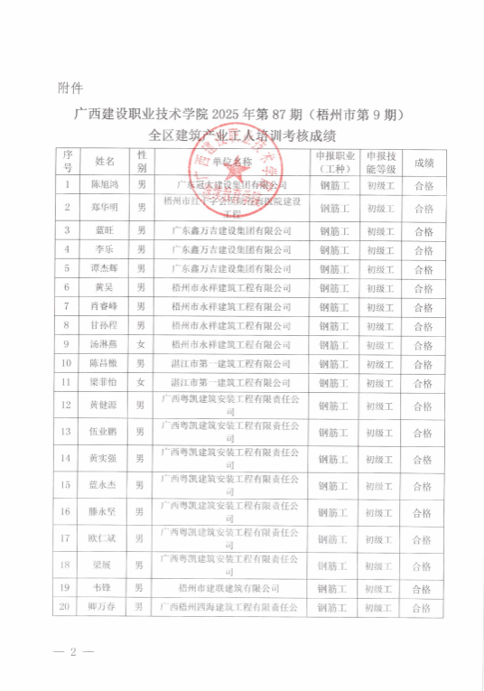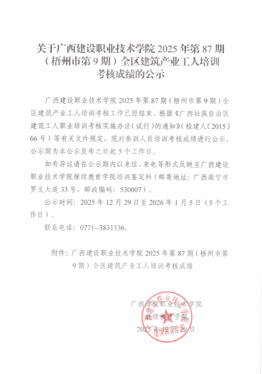 培训信息 当前位置: 首页 >> 培训信息 >> 正文 关于伟德国际1946源于英国2025年第87期(梧州市第9期)全区建筑产业工人培训考核成绩的公示 发布日期:2025-12-29 点击: 附件【关于伟德国际1946源于英国2025年第87期(梧州市第9期)全区建筑产业工人培训考核成绩的公示.pdf】已下载次