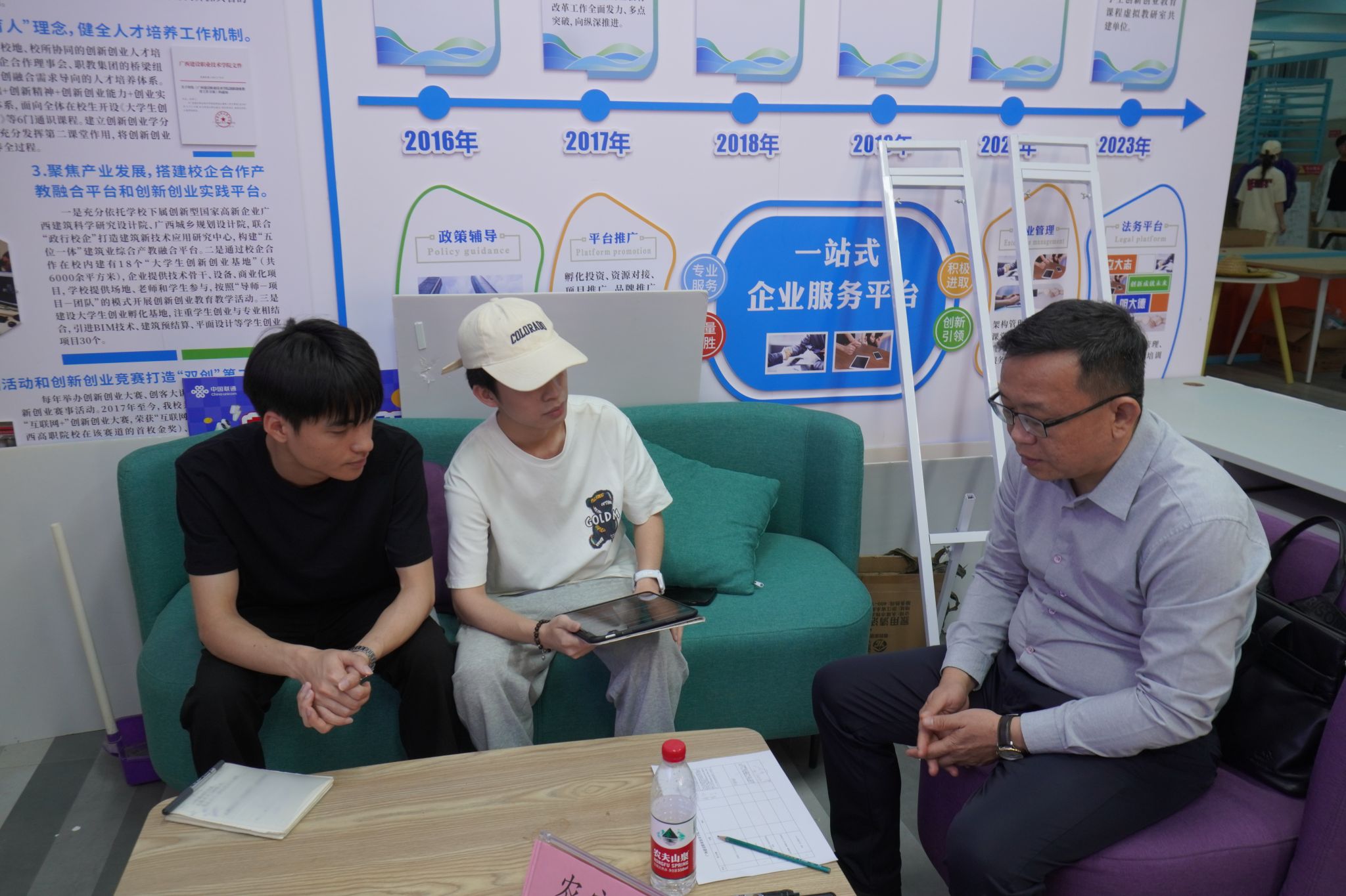 创业导师正专注听取学生团队的项目