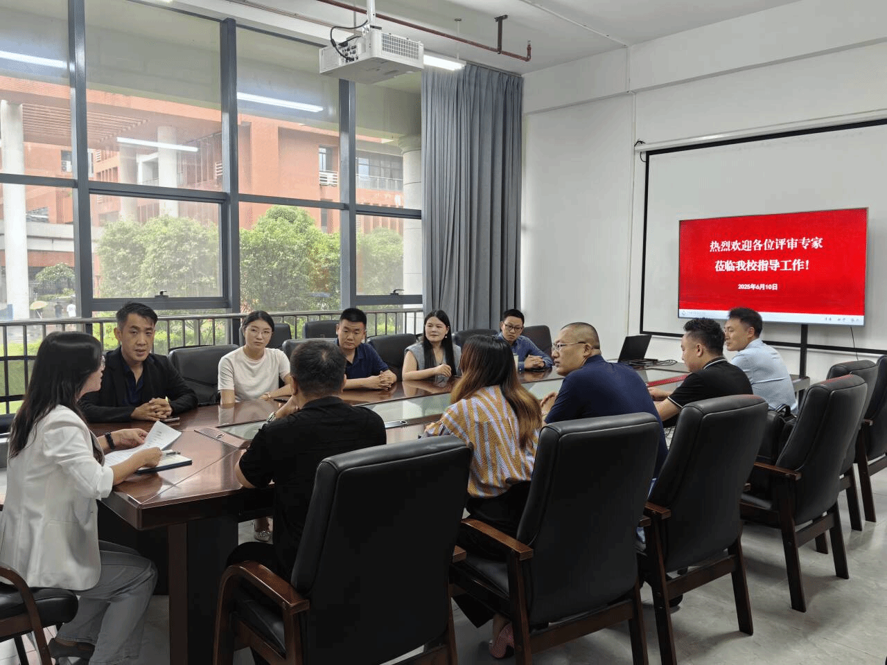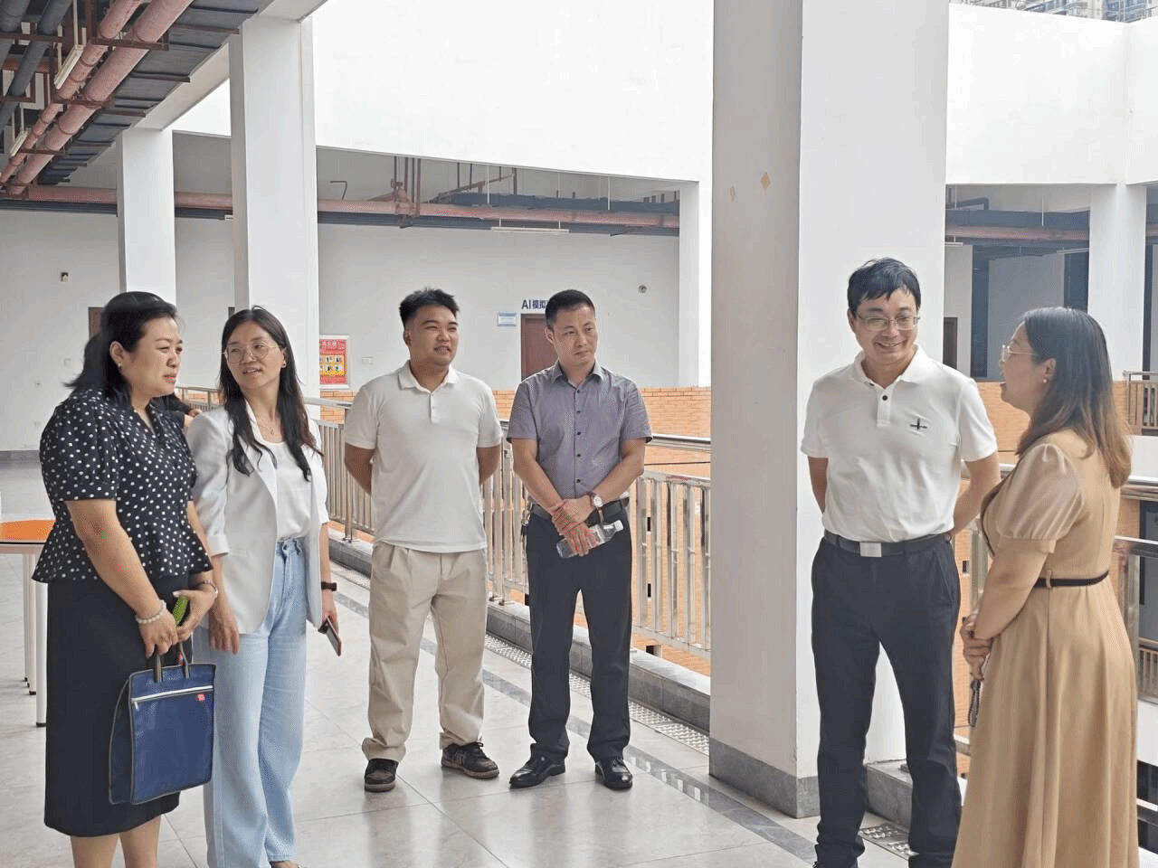 图为招生就业处处长与西乡塘区人社局局长苏岸芷等人交流