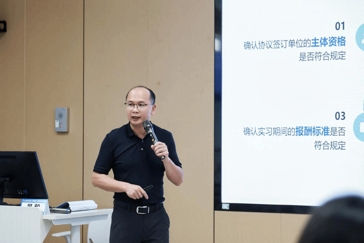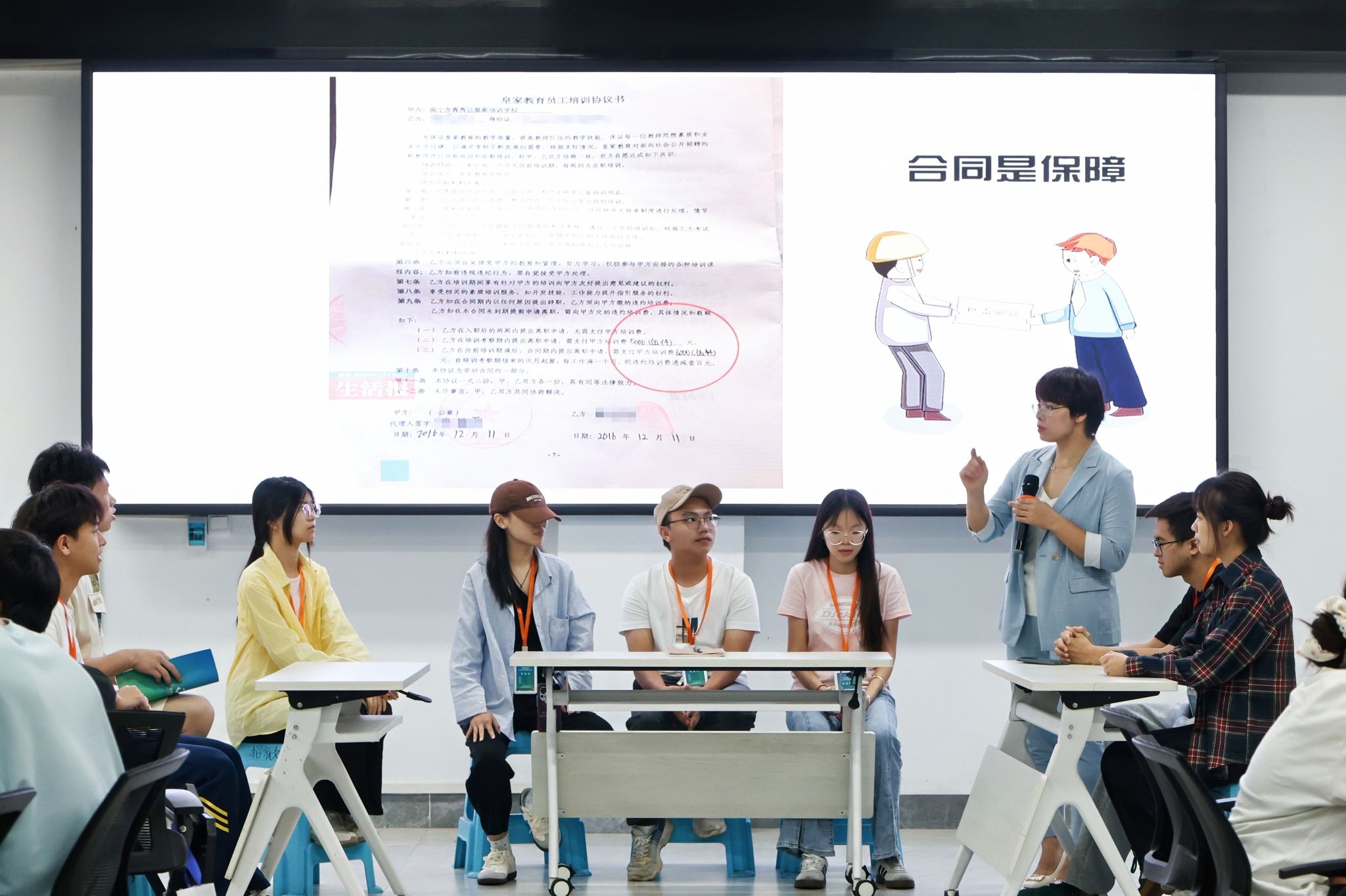 法庭模拟强化法律防护。“请大家明确各自角色,现在模拟庭审正式开始!”随着一声清脆的法槌声模拟音响起,一场沉浸式法庭模拟课程在本期培训班的课堂上拉开帷幕。针对学员普遍关注的“求职风险防范”这一薄弱环节与迫切需求,培训班特别邀请廖国葵、卢春竹等资深执业律师坐镇指导,精心搭建起高度还原的模拟庭审场景。课堂上,律师们将三方就业协议、劳动合同纠纷、试用期权益争议等常见求职风险案例转化为实训剧本,引导学员分别扮演法官、原告、被告、书记员等角色,完整演练法庭调查、举证质证、法庭辩论等庭审流程。每轮演练后,律师们结合《劳动合同法》等相关法规,细致解析求职中的权益边界与法律风险点,手把手指导学员如何运用法律武器维护自身权益。这场“实战化” 教学让抽象的法律条文变得可触可感,有效筑牢了学员的法律意识防线,为他们规避求职陷阱、保障职业权益装上了“防护盾”。