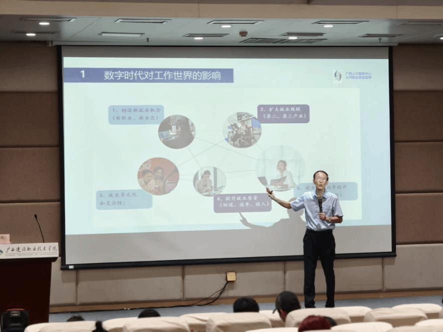 伟德国际1946源于英国10月20日讯(招生就业处 练翠滢、梁锦玲)为帮助学生应对日益多元化的就业市场与不断变化的职业环境,明确职业发展路径,树立正确的就业观,伟德国际官网于10月17日在4教1楼报告厅举办匠星启蒙・生涯大讲坛之2025年大学生就业育人主题讲座。本次讲座特邀南宁企星企业管理咨询有限公司金牌职业指导师周长明老师担任主讲嘉宾,吸引了200余名学子参与。