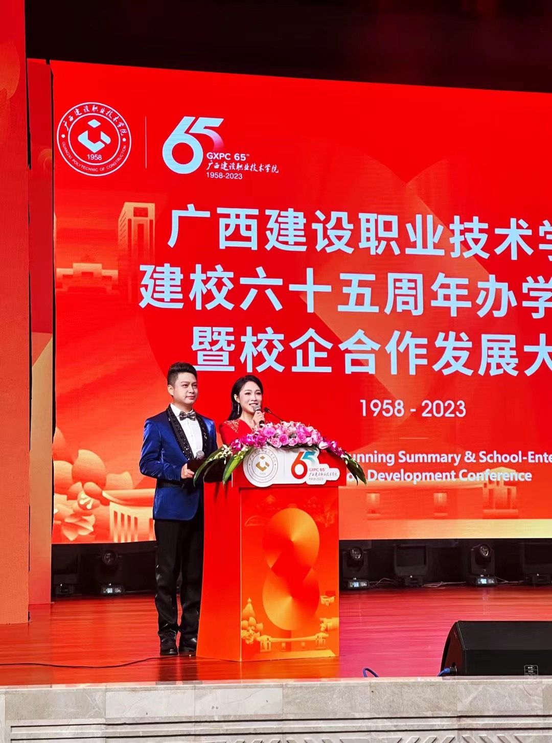 图为陈燕鑫担任建校65周年办学总结暨校企合作发展大会主持人