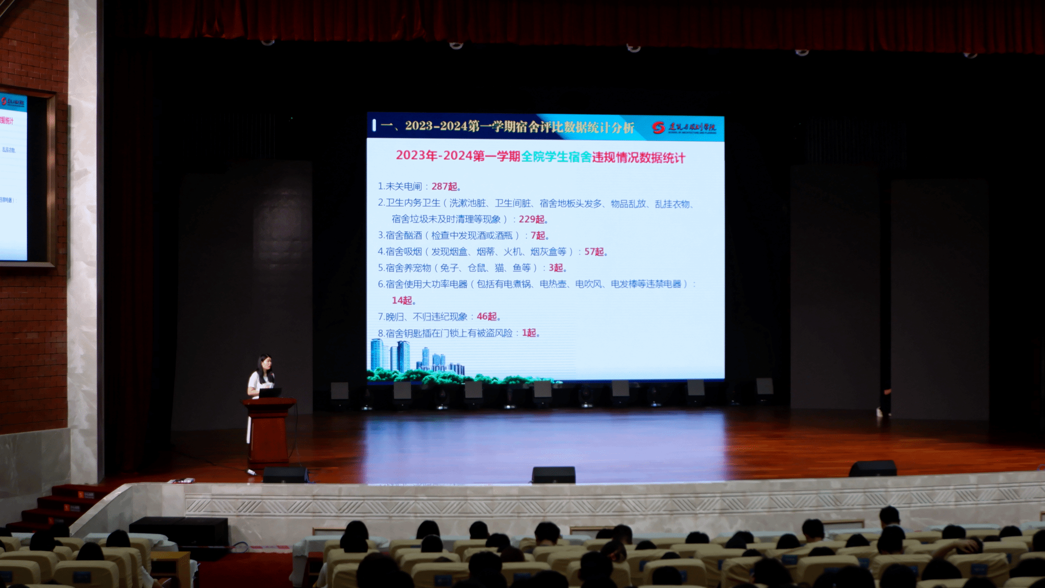会议分为四个议程,一是由蒋诗南老师分析2023-2024学年第一学期文明宿舍评比情况,强调宿舍管理常见安全隐患及近期安全警示案例;二是进行2023-2024学年第一学期文明宿舍颁奖;三是文明宿舍代表发言;四是学院副院长刘继骁致辞。