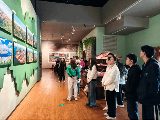 步入博物馆大厅,映入眼帘的是巨型铜鼓雕塑,其独特的造型和精美的纹饰,承载着壮乡人民的信仰与智慧,开启了师生探寻民族文化之旅的序幕。师生们依次参观了“铜鼓文化展”“五彩八桂”“霓裳羽衣”等多个特色展厅。特别是壮族干栏式建筑、侗族鼓楼和风雨桥等传统建筑模型,以精巧的工艺和独特的结构,引发了师生们的热烈讨论。而在民族服饰展中,壮、瑶、苗、侗等12个世居民族色彩斑斓、风格各异的服饰,也给师生们留下深刻的印象。