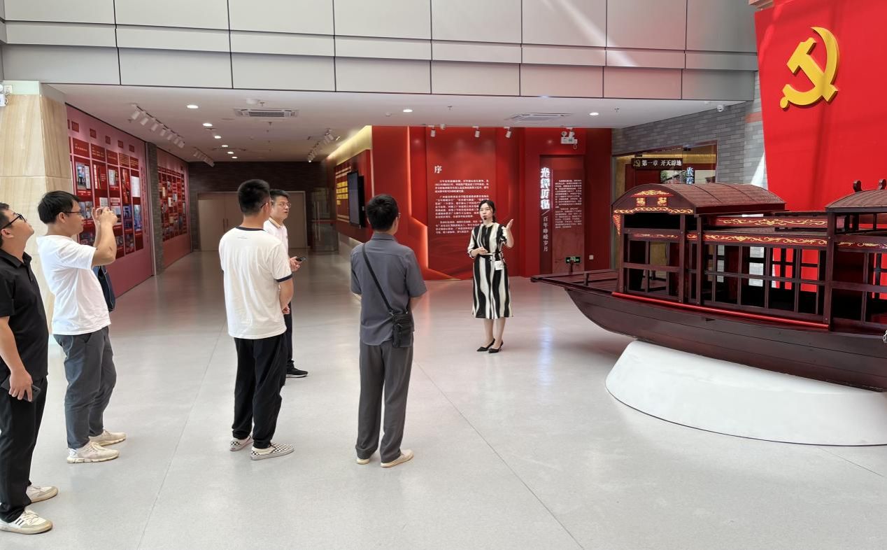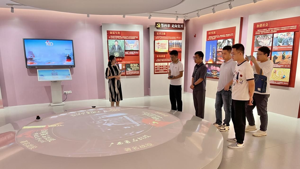 在党建思政教育基地,李恒凤老师向嘉宾们依次介绍了党史教育馆、思政课虚拟仿真教学中心、360度沉浸式爱国主义教育体验馆,通过实地参观考察和沉浸式的场景体验,让来访嘉宾更加鲜活、立体地感受“馆课结合”主题互动体验式的教学方式。同时,分享了我院在思政教育之中灵活运用VR技术的经验做法,通过视觉、听觉等全方位立体化运用,打造出沉浸式、可互动的智慧学习体验。