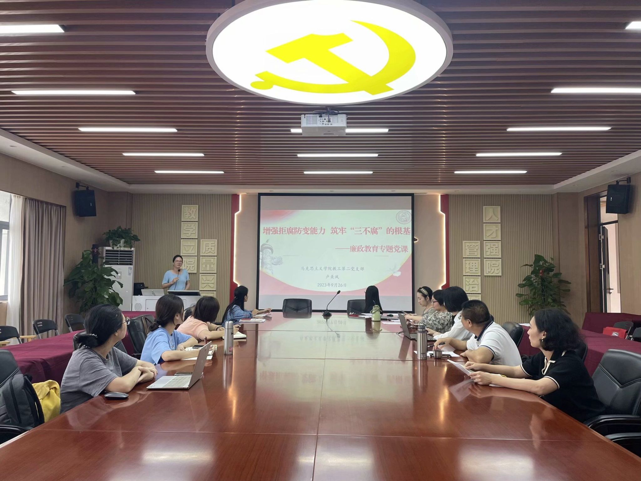 马克思主义学院9月27日讯(文/潘柳虹 图/曹桃)为深入学习宣传贯彻党的二十大精神,把习近平新时代中国特色社会主义思想转化为坚定理想、锤炼党性、指导实践、推动工作的强大力量,提高党员教师清正廉洁、忠诚干净、甘于奉献的意识,2023年9月26日,马克思主义学院教工第二党支部在3教703开展廉政教育专题党课,由支部书记卢美凤主讲,支部全体党员参加了党课。
