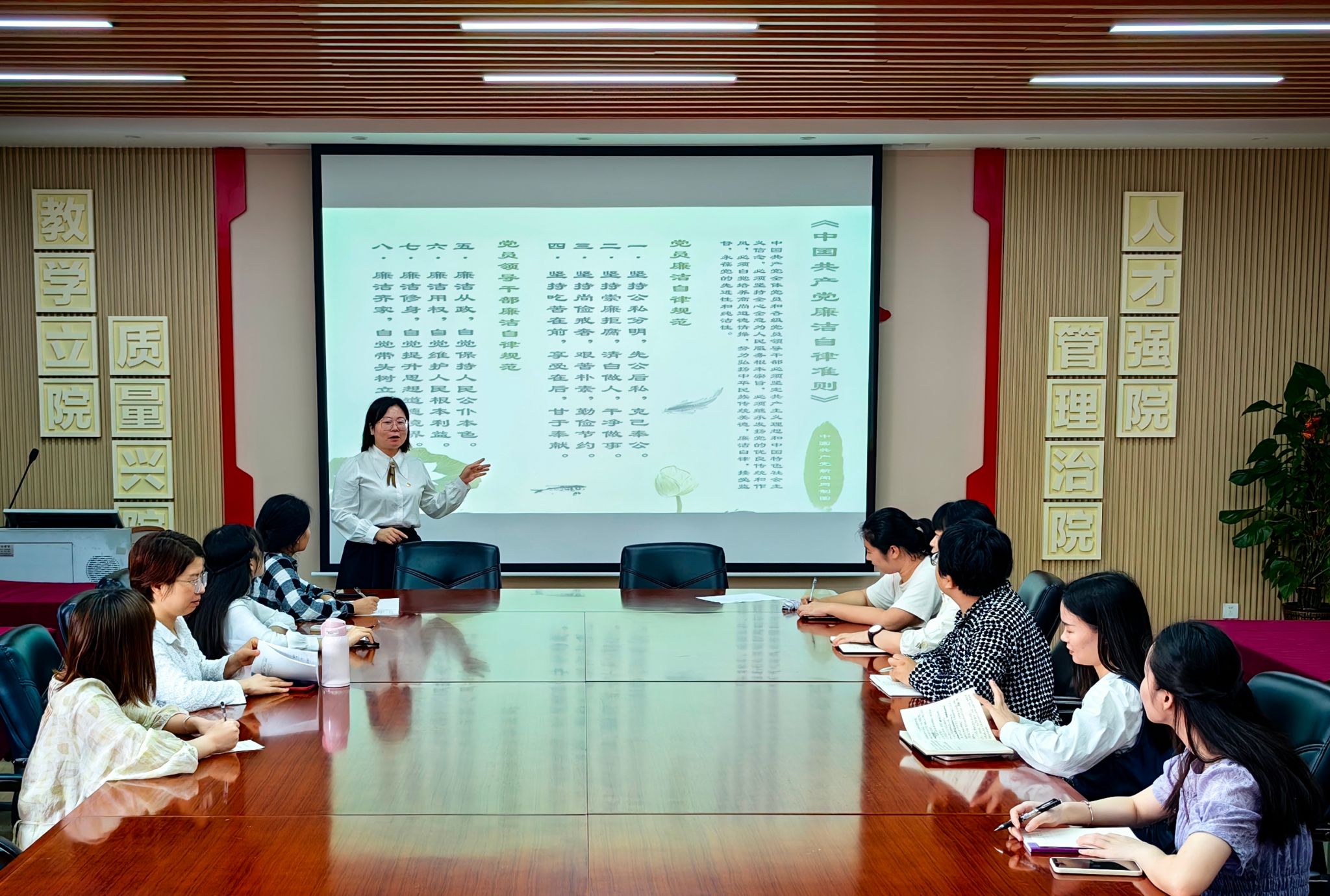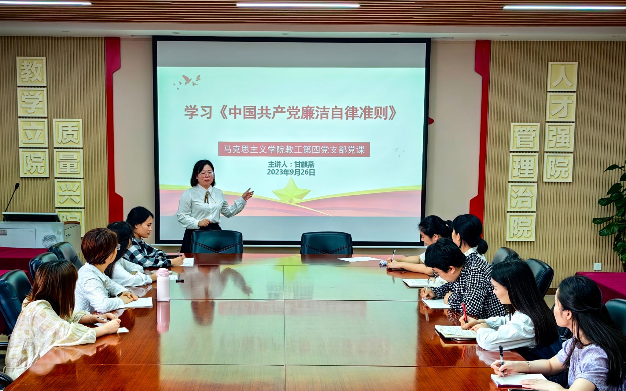 马克思主义学院9月27日讯(图/韦益春 文/陆迪琴) 为进一步提高党员教师的党性修养,增强组织纪律观念,铸牢党员思想防线,9月26日下午,马克思主义学院教工第四党支部在3教703会议室集中学习《中国共产党廉洁自律准则》(以下简称《准则》)。