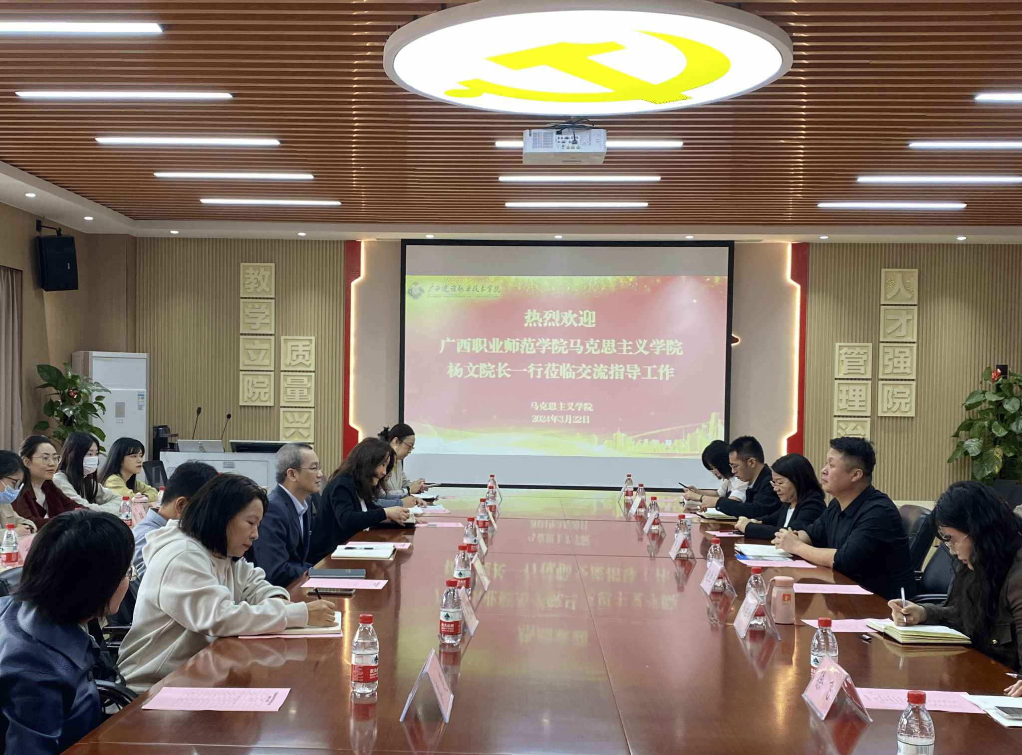 马克思主义学院3月22日讯(文/曹桃 图/毕莉、陈幻) 3月22日上午,广西职业师范学院马克思主义学院党总支书记、院长杨文一行16人到我院开展交流学习活动,我院党总支书记、院长邱岚、副院长赵胜营与各党支部书记、专任教师代表参加。