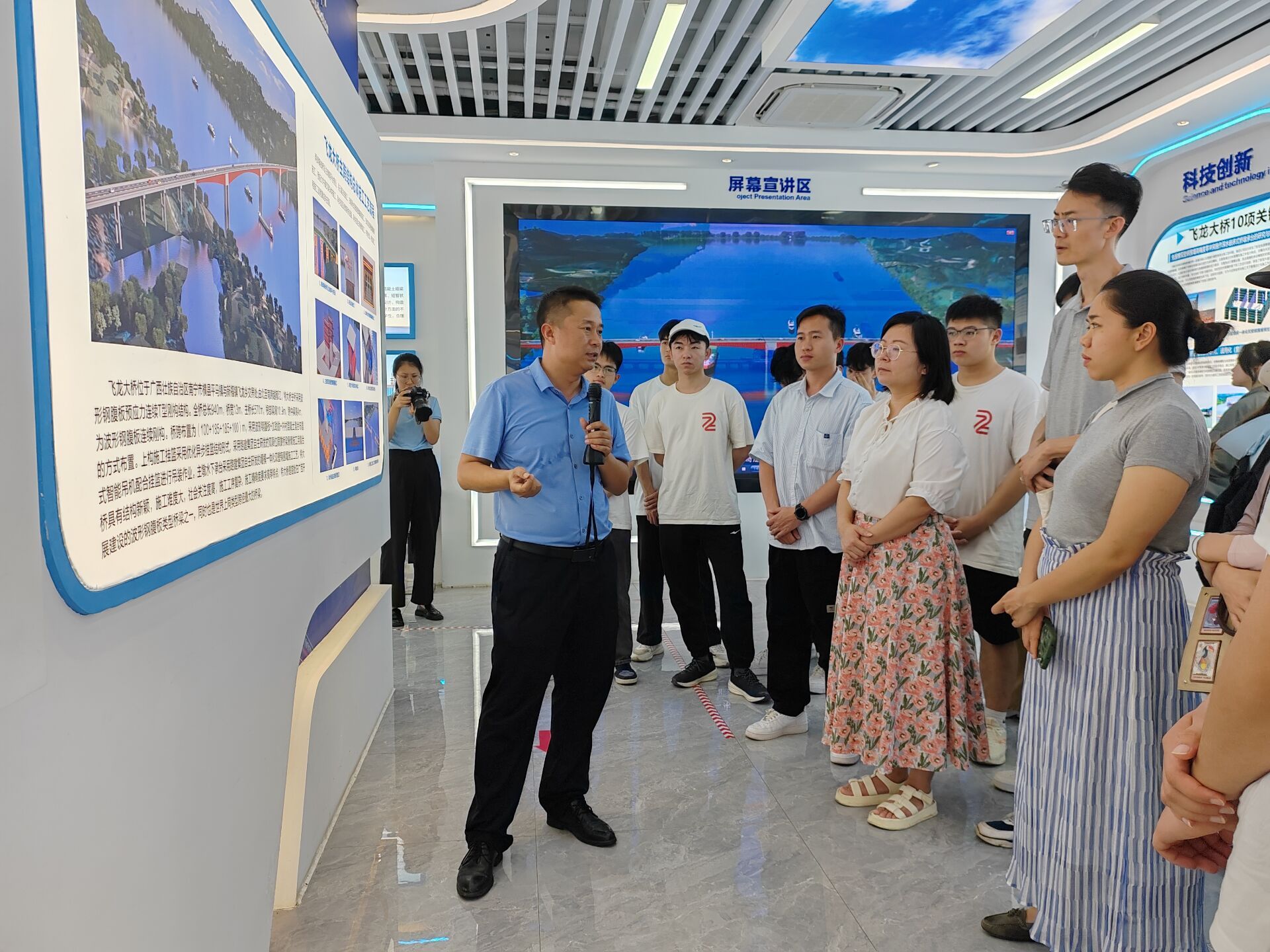 在飞龙大桥科技创新成果展示基地新匠坊,师生们跟随讲解员的脚步,进一步了解飞龙大桥工程建设概况和绿色示范应用、BIM信息化应用等关键技术,大家在介绍中深刻体会到飞龙大桥建设团队的技术实力和专业精神,也激发了他们对科技创新和绿色施工的浓厚兴趣和热情。