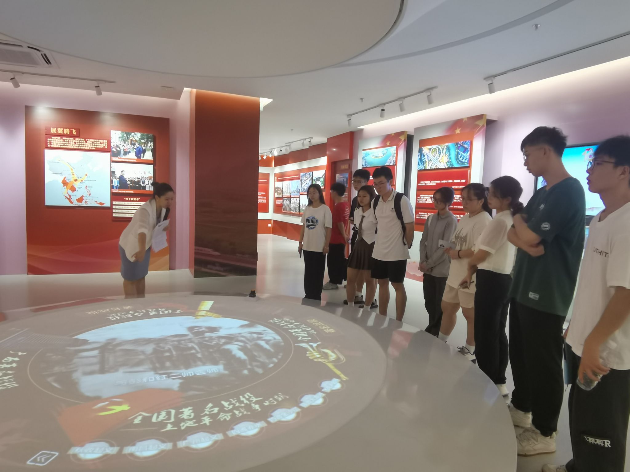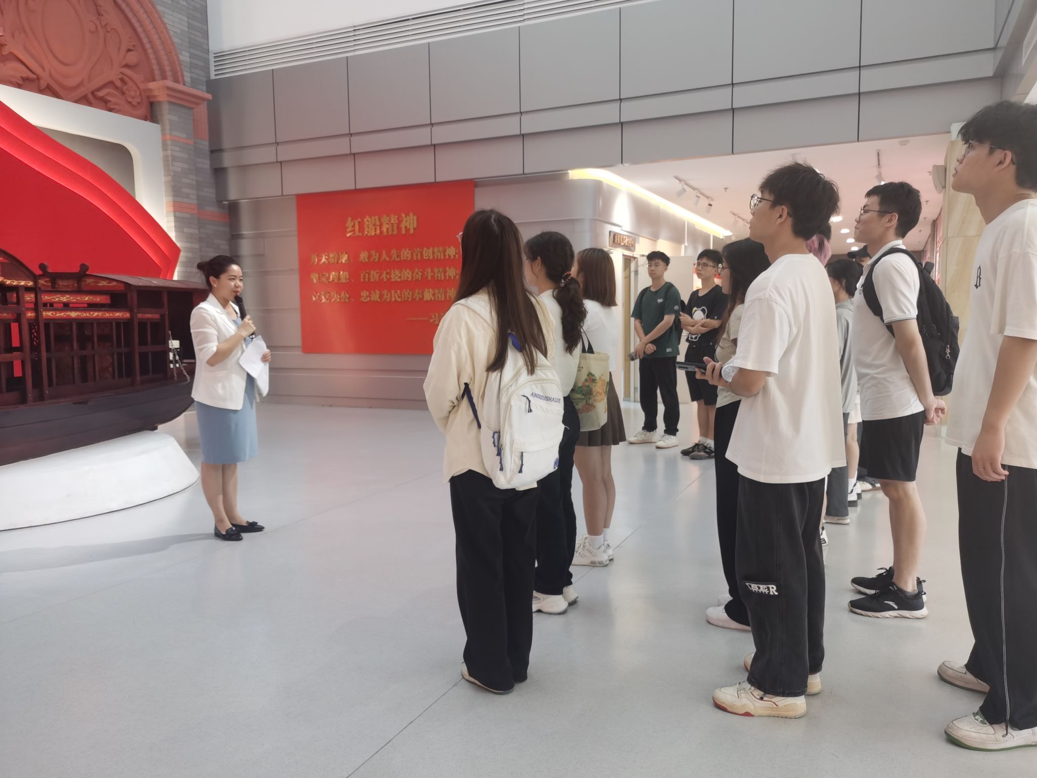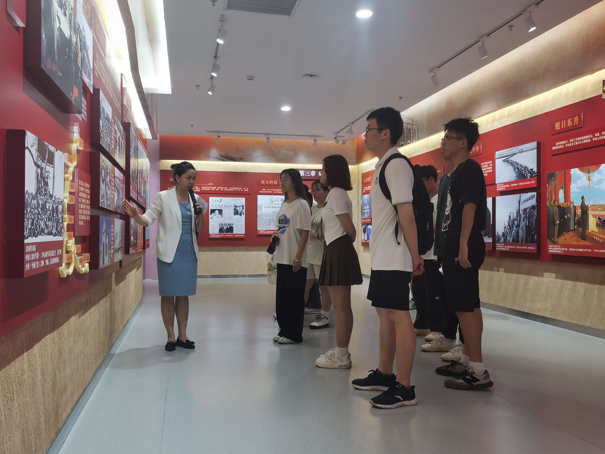 本次赛前培训由刘荔源老师主讲,刘老师首先向参赛选手们讲解了大学生金牌解说员比赛的规则,并带领选手们深度学习、了解基地各场馆的功能、教学资源以及解说规范,并对各场馆内丰富的党史故事进行深度讲解,让选手们从知其然上升到知其所以然,进一步理解中国共产党为什么能、中国特色社会主义为什么好,归根到底是马克思主义行、是中国化时代化的马克思主义行。最后,刘老师给选手们示范了全程解说,并进行了赛前答疑。