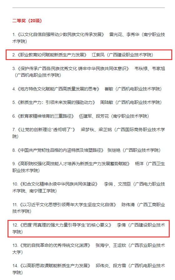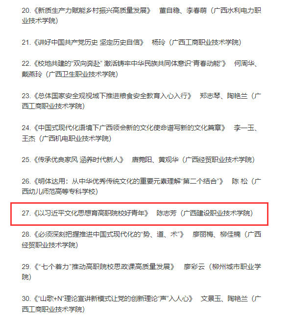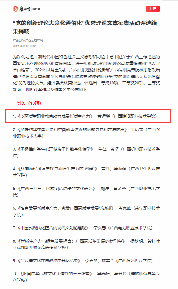 据悉,为深化习近平新时代中国特色社会主义思想和习近平总书记关于广西工作论述的重要要求的理论研究和宣传阐释,进一步推动党的创新理论高质量传播和“飞入寻常百姓家”,2024年4月至6月,广西日报理论评论部和广西高职高专院校思想政治理论课建设联盟面向全区高职高专院校思政课教师征集“党的创新理论大众化通俗化”优秀理论文章。按照活动要求,我院加强工作组织、广泛发动全院思政课教师积极参与、踊跃投稿,并取得优异成绩。