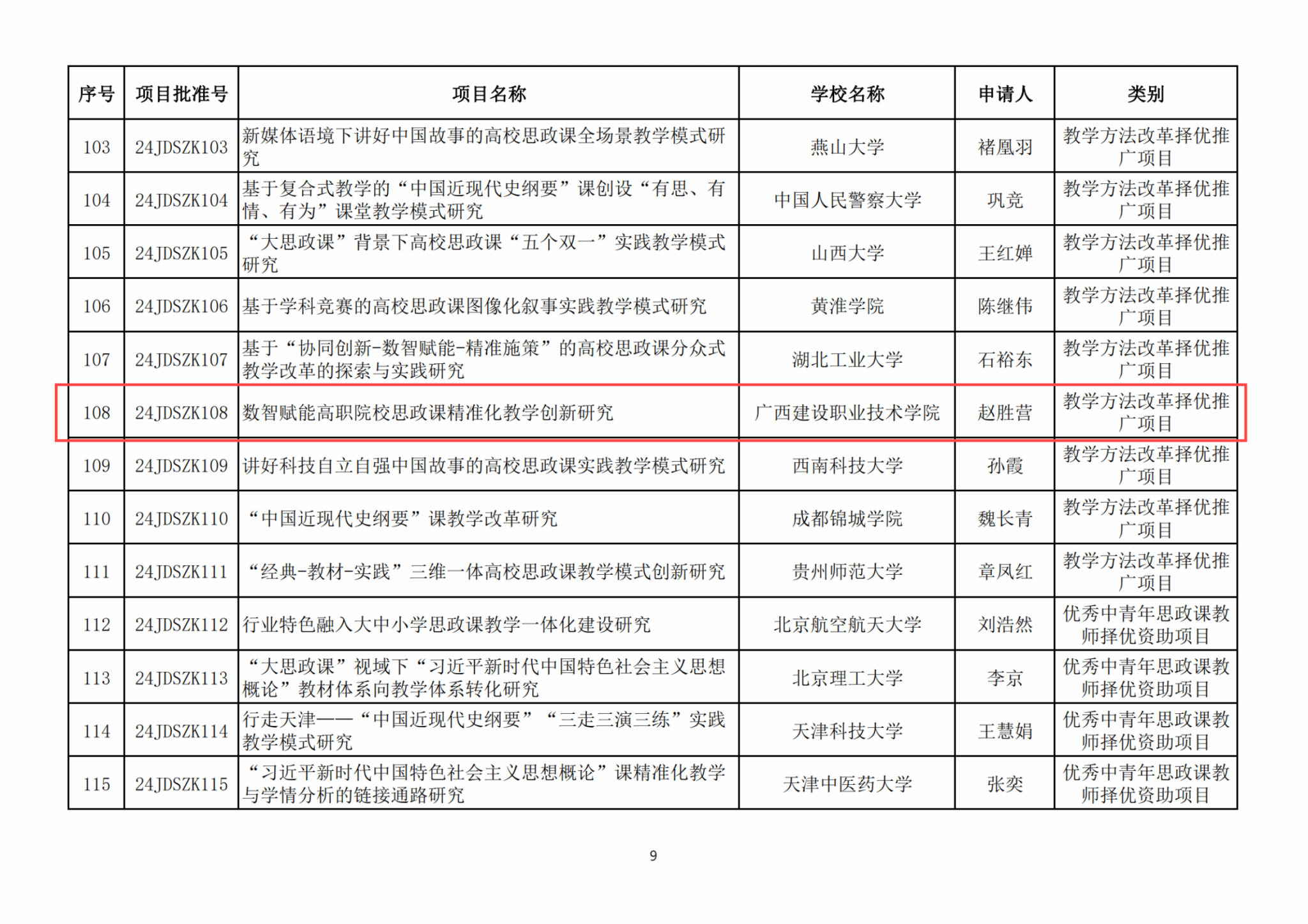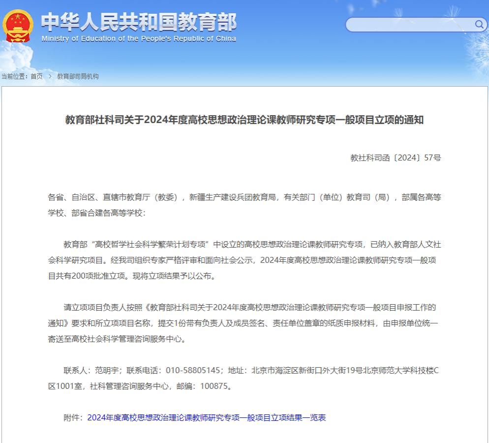 据悉,教育部“高校哲学社会科学繁荣计划专项”中设立的高校思想政治理论课教师研究专项,已纳入教育部人文社会科学研究项目。本年度高校思想政治理论课教师研究专项一般项目共有200项批准立项,其中,高校思想政治理论课教学方法改革择优推广项目立项总数仅10项。