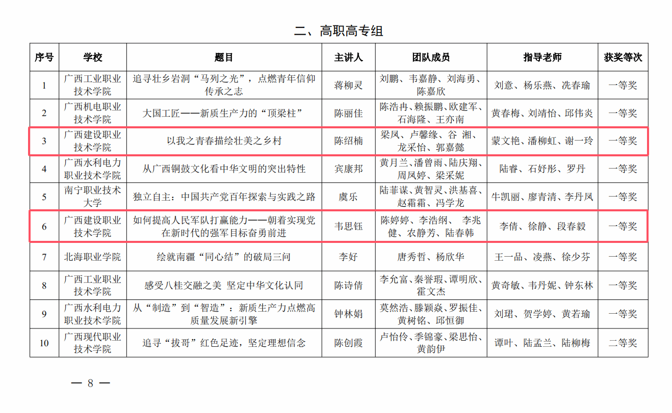 马克思主义学院11月28日讯(文/图 宋佳雄)近日,自治区教育厅公布了2024年广西高校大学生讲思政课公开课展示活动获奖名单。我院思政课教师蒙文艳、潘柳虹团队参评的作品《以我之青春描绘壮美之乡村》,李倩老师团队参评的作品《如何提高人民军队打赢能力—朝着实现党在新时代的强军目标奋勇前进》分别荣获高职高专组一等奖。