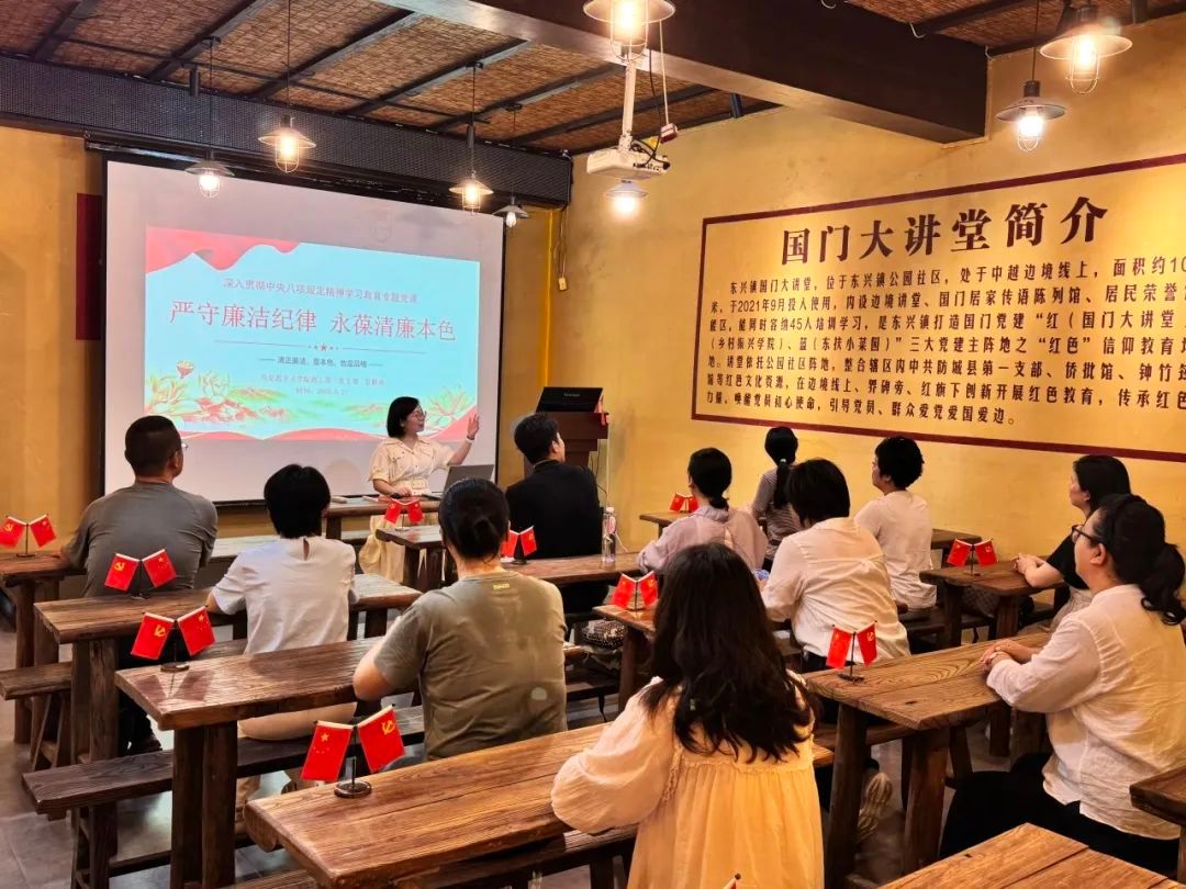 6月20日上午,支部党员齐聚东兴“国门大讲堂”,聆听专题党课。支部书记甘麒燕同志以“严守廉洁纪律,筑牢永葆清廉本色”为主题,紧扣学习贯彻习近平总书记关于党的作风建设重要论述,要求党员教师时刻保持警醒,以更高标准、更严要求,持之以恒加强纪律作风建设。支部副书记莫玉婵同志以“让愿担当敢担当善担当蔚然成风”为题,强调党员教师要不断加强党性修养,以对党忠诚、为党分忧、为党尽职、为民造福的政治担当,满怀激情地投入新时代中国特色社会主义伟大实践。