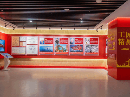 以“党史教育馆”为“轴”,设置了光辉历程、筑梦中国、奋进建院三个展区,通过丰富的史料图文展板、一体机多主题展示屏幕、互动投影历史珍贵影像、独具创新特色的滑轨屏数据短片等,增强场馆吸引力。