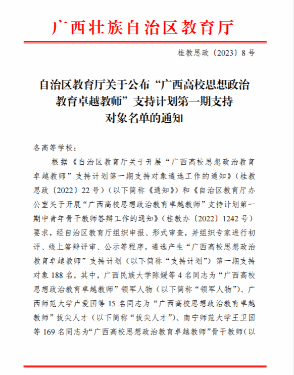 喜报!马克思主义学院2名教师入选“广西高校思想政治教育卓越教师”支持计划