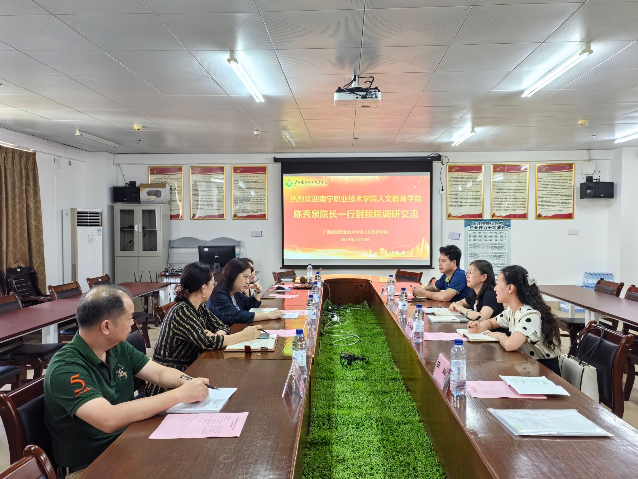 2024年5月13日下午,南宁职业技术学院人文教育学院陈秀泉院长一行4人到我院进行调研交流。我院杨飒飒书记、罗新华副院长等5人参加了此次交流活动。双方就推广使用国家通用语言文字工作以及相关问题交换了意见,进行了热烈友好的讨论。交流会取得圆满成功。