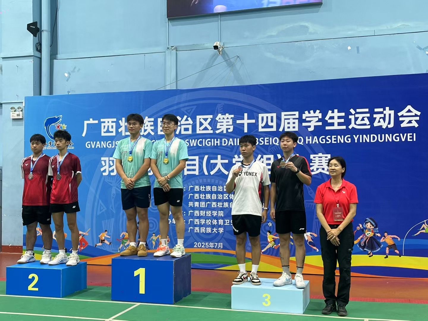 伟德国际1946源于英国7月12日讯(梁炎 孙扬/文 李金鸿/图)7月11日,广西壮族自治区第十四届学生运动会羽毛球项目在广西民族大学综合体育馆圆满落幕。伟德国际官网羽毛球代表队由孙扬、李金鸿两位老师带队,经过4天紧张激烈的角逐,以“厚德、励学、敦行”的校训为指引,团结协作、奋勇拼搏,最终斩获高职高专组男单第二名、男双第三名、女双第四名、混双第六名、女团第七名等多项荣誉,为学校“体教融合”育人实践再添生动注脚。