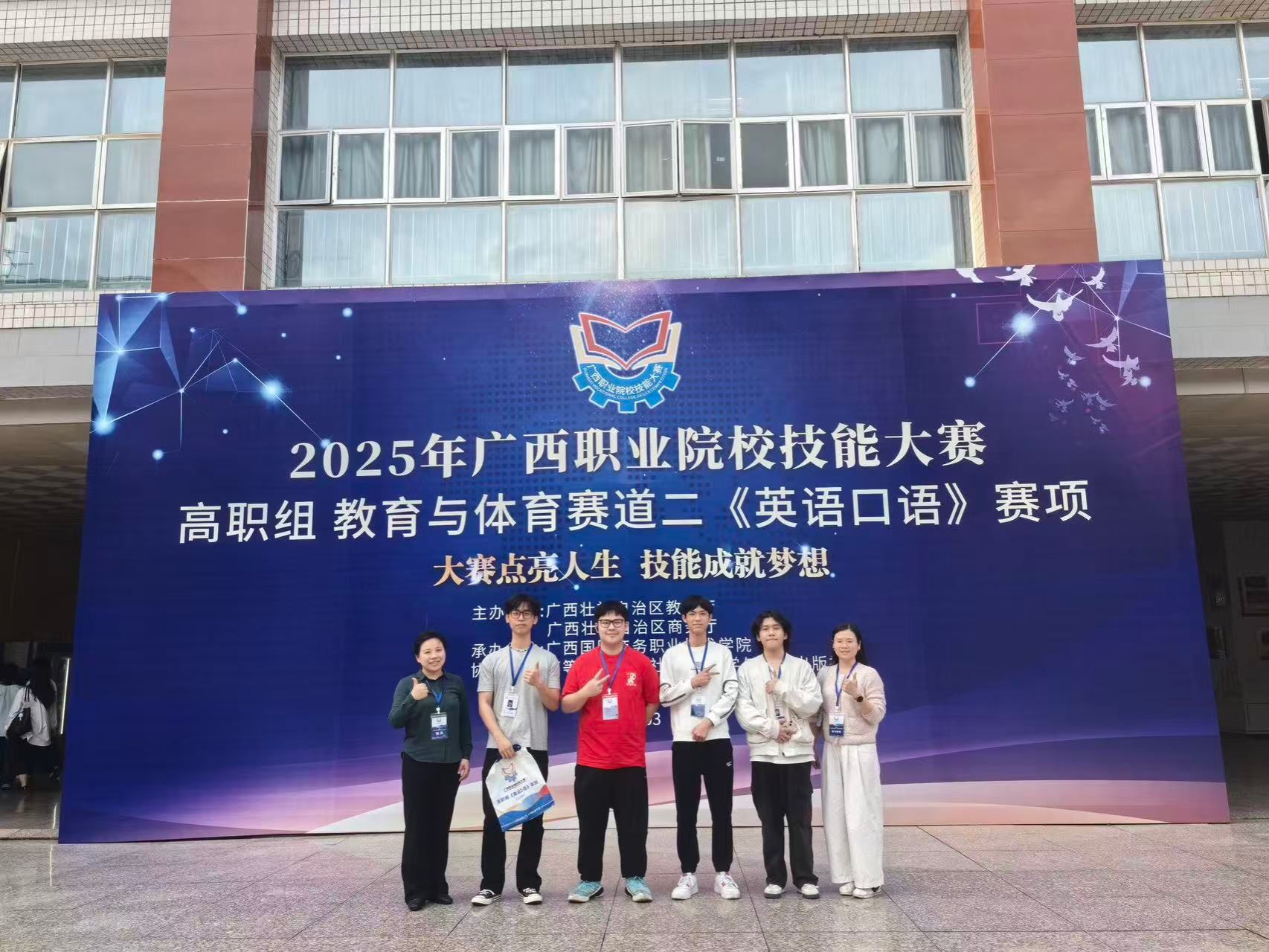 闭思鼎同学(右二)与同学和老师参加2025年广西职业院校技能大赛高职组《英语口语》赛项比赛,并荣获铜牌