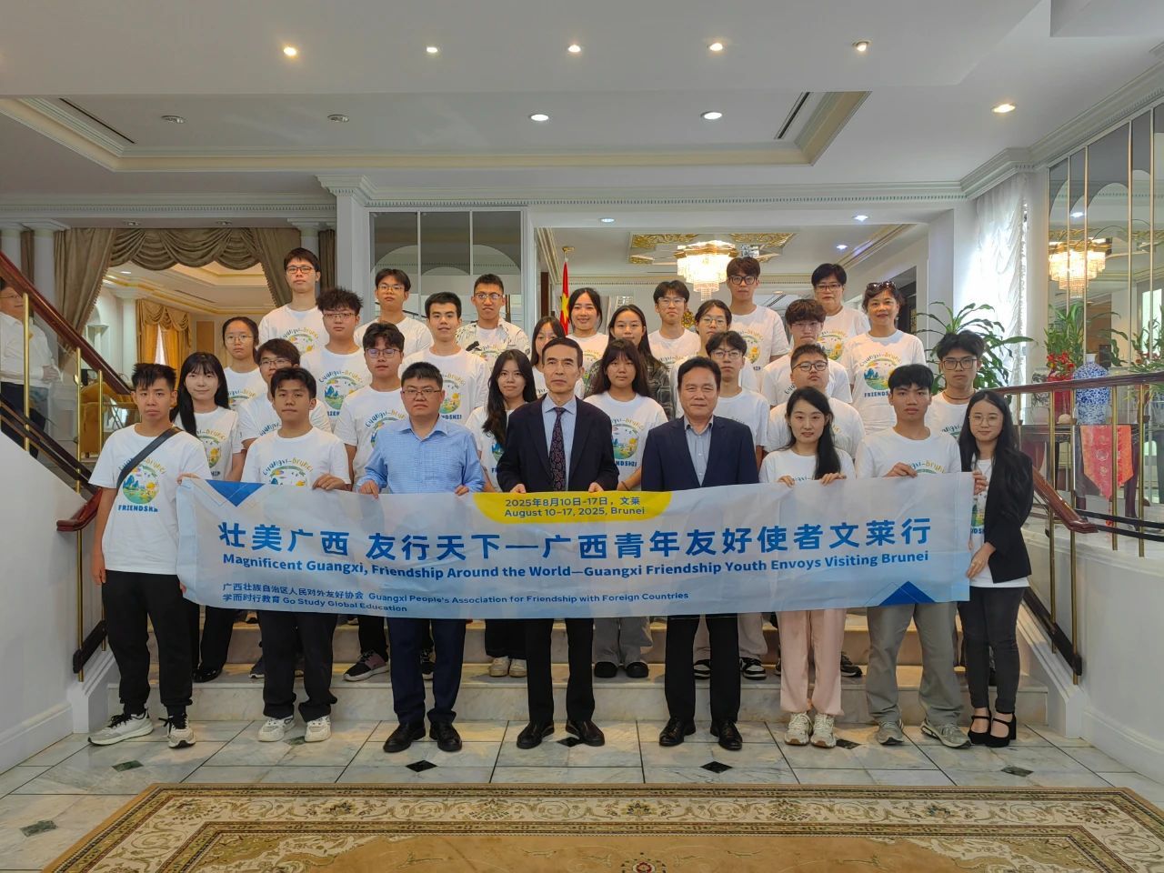 中国驻文莱大使肖建国与闭思鼎(一排左二)等参加“壮美广西 友行天下——广西青年友好使者文莱行”活动的师生合影