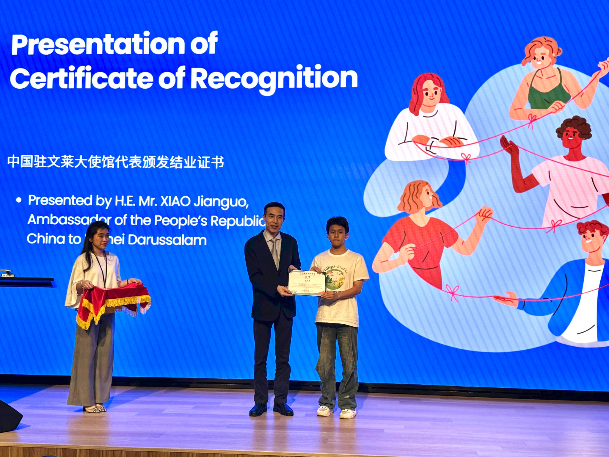 中国驻文莱大使肖建国大使为闭思鼎颁发“广西青年友好使者”证书