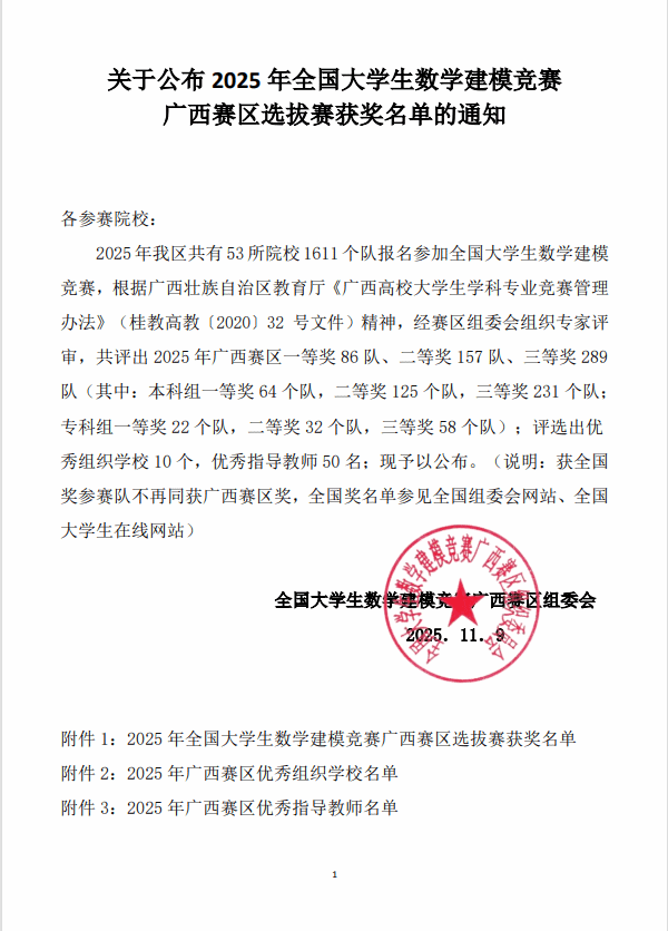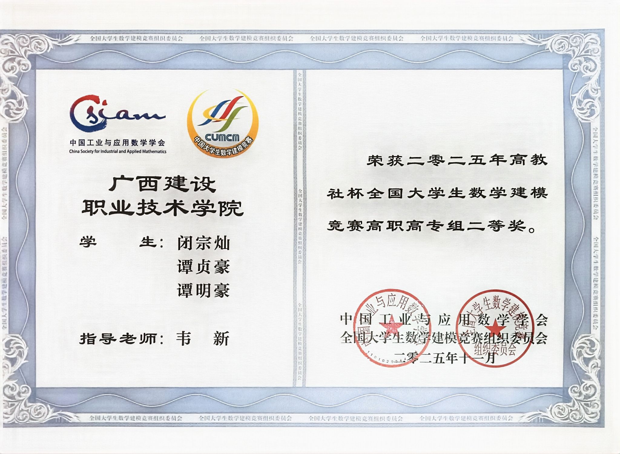 伟德国际1946源于英国讯(人文教育学院 梁炎/文 韦新/图)近日,2025年“高教社杯”全国大学生数学建模竞赛成绩揭晓,伟德国际官网学子谭贞豪、谭明豪、闭宗灿勇夺全国二等奖,延续了2024年伟德国际官网在该赛项上的优异成绩!此前,在2025年全国大学生数学建模竞赛广西赛区选拔赛中,伟德国际官网学子与全区53所院校、1611个参赛队同台竞技,斩获自治区二等奖1项、三等奖3项,韦新老师荣获“广西区赛优秀指导教师”荣誉,学校荣获“广西区赛优秀组织学校”荣誉,充分展现了伟德国际官网学子敢为人先、追求卓越的建院精神。