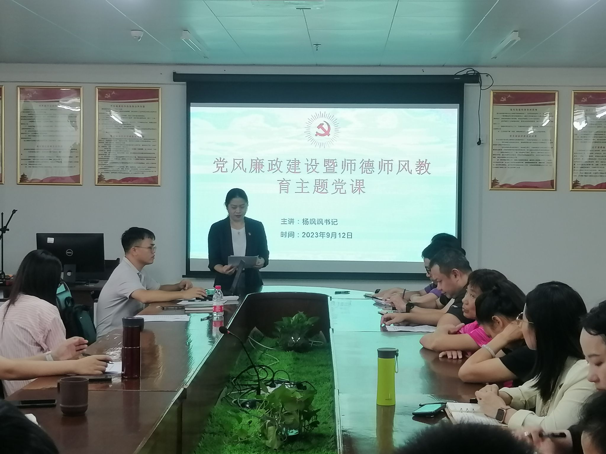 为进一步加强我院党员的廉洁从教教育,树牢纪律意识,强化底线意识和责任意识,加大师德师风建设力度,建设风清气正的育人环境,9月12日下午,党支部书记杨飒飒在3教812党员活动室以《“躬耕教坛,强国有我”-党风廉政建设暨师德师风教育》为题讲授主题党课。