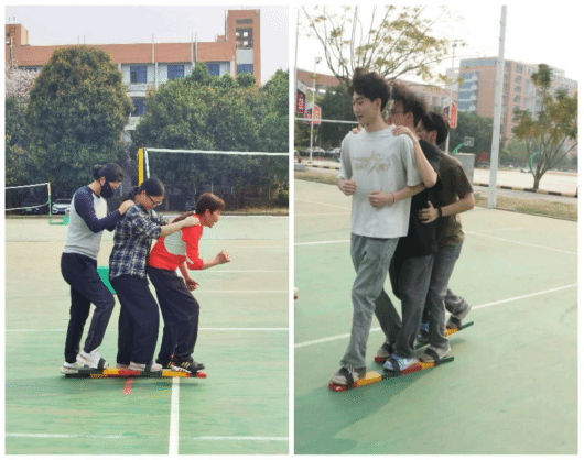 三人板鞋竞速将活动推向高潮。三人一组脚绑板鞋,向终点迈进,在“一二一二”“左右左右”整齐划一的口号声中、在现场观众热烈欢快的掌声中,师生尽情体验着这项运动带来的独特乐趣,也在体验中加深对少数民族体育运动的认识和热爱。