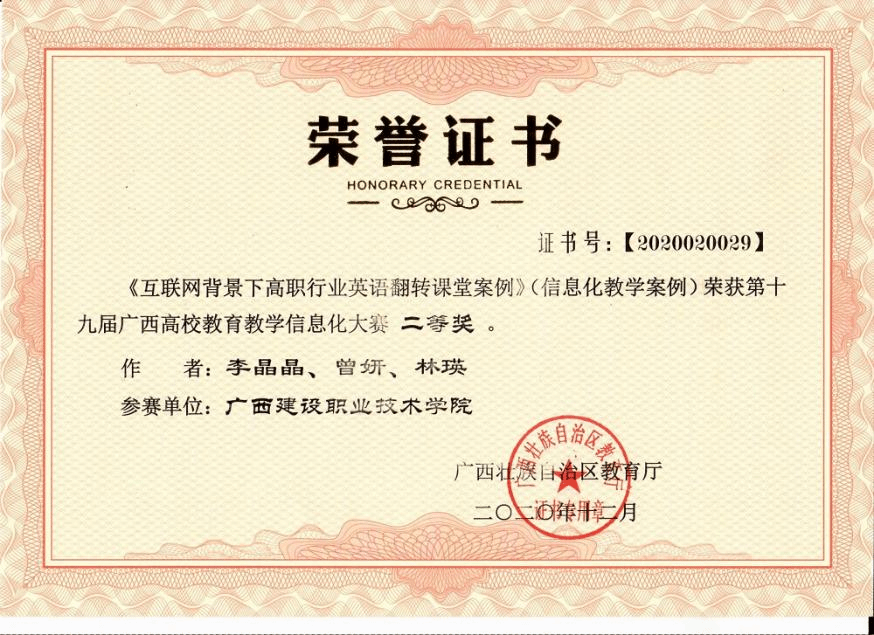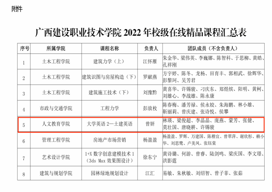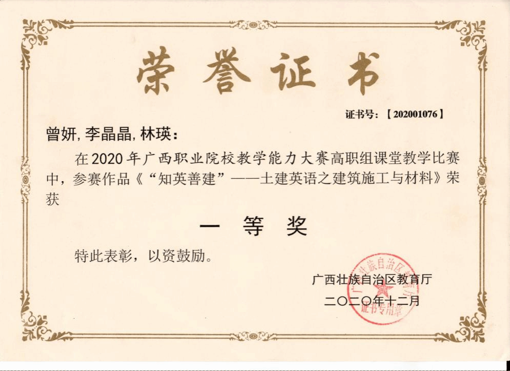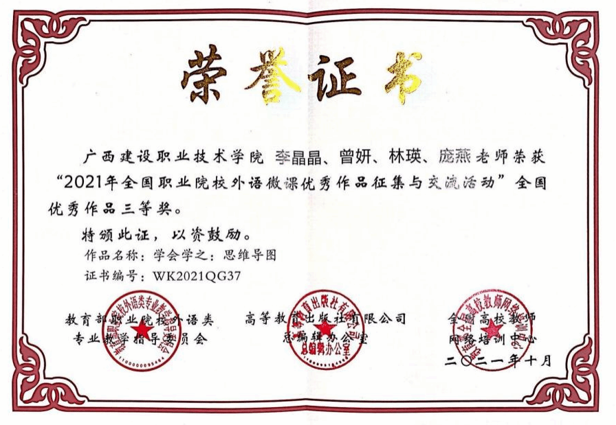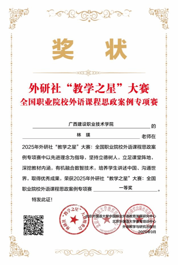 人文教育学院英语教研室是一个团结奋进、开拓创新的团队。现有教授1人,副教授8人;具有博士学位的教师2人,硕士学位的教师10人;广西科协智库专家1人,具有出国留学经历教师7人。教研室紧密结合职业教育的特点,将英语教学与职业素养培养深度融合,打造出一套既注重语言技能提升又强调职业应用能力的实用型英语教学体系,致力培养具有国际竞争力与职业素养的高素质应用型人才。多年来,英语教研室始终以提升教学质量、教学科研能力和社会服务能力为导向,取得了一系列亮眼的成绩。