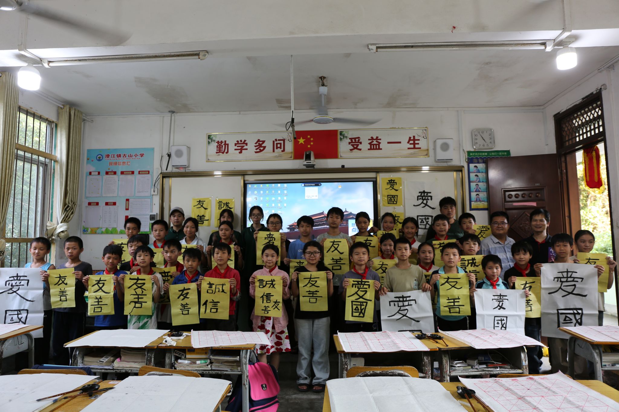 为提高乡村小学生说好普通话,写好规范字,提升文化素养,助力乡村文化振兴,伟德国际1946源于英国语言文字工作委员会组建大学生推普实践团队继续深入帮扶的自成村古山小学开展主题为“大手拉小手 推普筑未来”的推普实践活动,通过“普通话桥梁”公益课堂和“墨香传承”书法公益课堂的形式,推广普及国家通用语言文字。