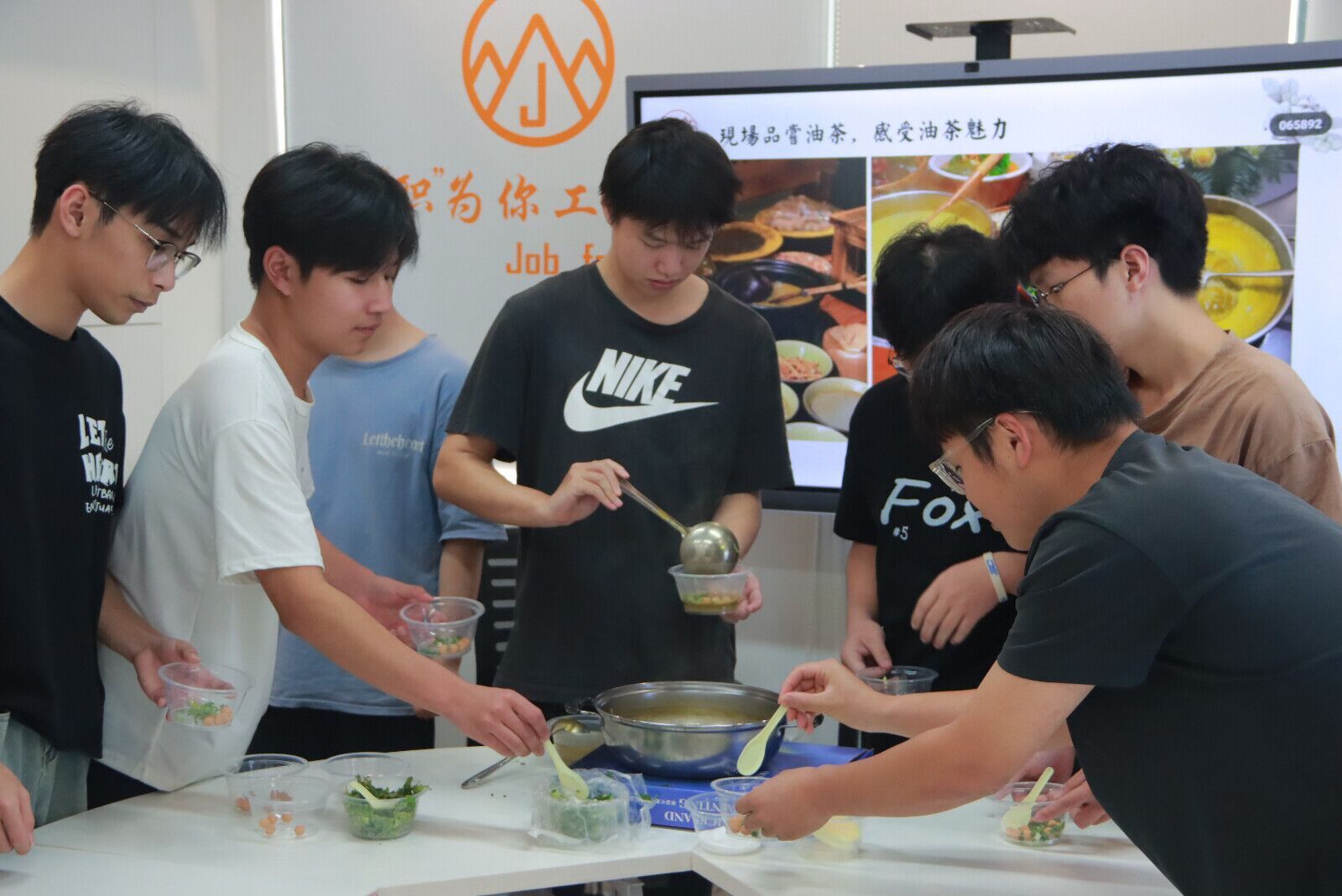 随后的环节更是让场下同学们感受到了文化与味觉的双重盛宴。唐景罗学长现场邀请同学们一起动手制作并品尝了正宗的恭城油茶。这种独具特色的美食,不仅让同学们大开眼界,也在其独特的风味中体验到了恭城人民的智慧与历史沉淀。在品尝的过程中,同学们的脸上洋溢着满足的笑容。他们纷纷表示,通过这样的活动,不仅仅得到味蕾的体验,更加深了对非物质文化遗产的了解。
