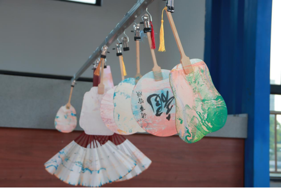 国漆流动,色染东方,体验非遗漆扇之美。漆扇Diy同样吸引了大家的目光。同学们认真聆听老师讲解漆染的历史发展与漆扇的制作技巧,拿出提前准备的小团扇、折扇、大漆颜料等物品,根据自己的喜好选择颜料,将扇面放入被颜料渲染好的漆桶中,以点、甩、弹、划等手法,在水面绘出图案效果,再晕染在团扇表面,形成妙趣横生、浑然天成的漆色纹理。现场欢声笑语,无不惊叹于每一个成品的独一无二。