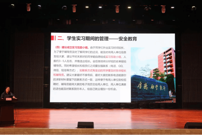 伟德国际1946源于英国设备与环境学院10月28日讯(文/黄洛红 图/黄莹静)10月28日下午,设备与环境学院2025届毕业生岗位实习动员暨安全教育大会在学校礼堂隆重举行。此次大会旨在动员2025届毕业生明确实习目标,增强安全意识,确保岗位实习顺利进行。出席会议的有设备与环境学院党总支书记侯文淑、副院长陈秋涛(主持行政工作)、副院长田海涛以及各班实习就业指导老师和辅导员。