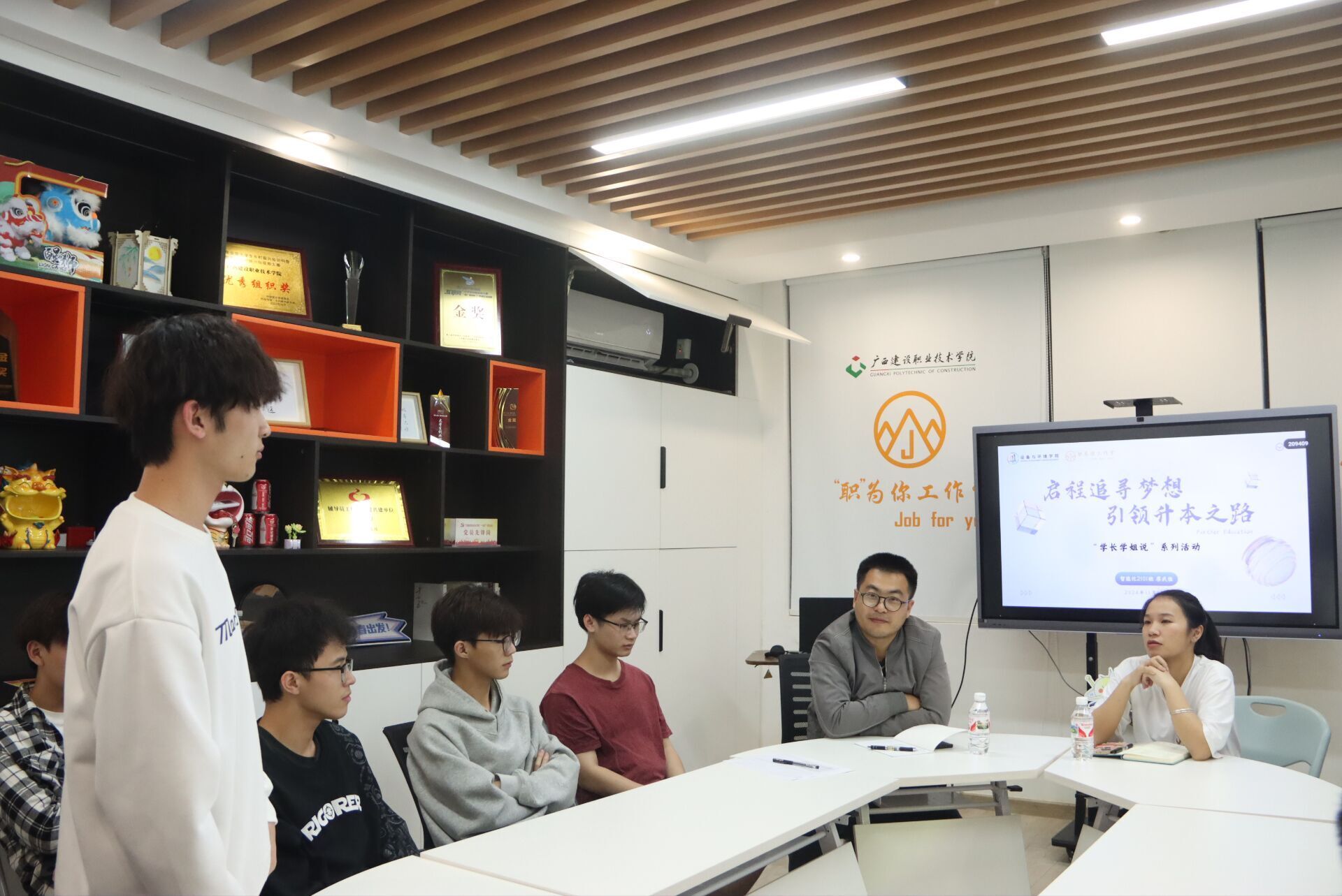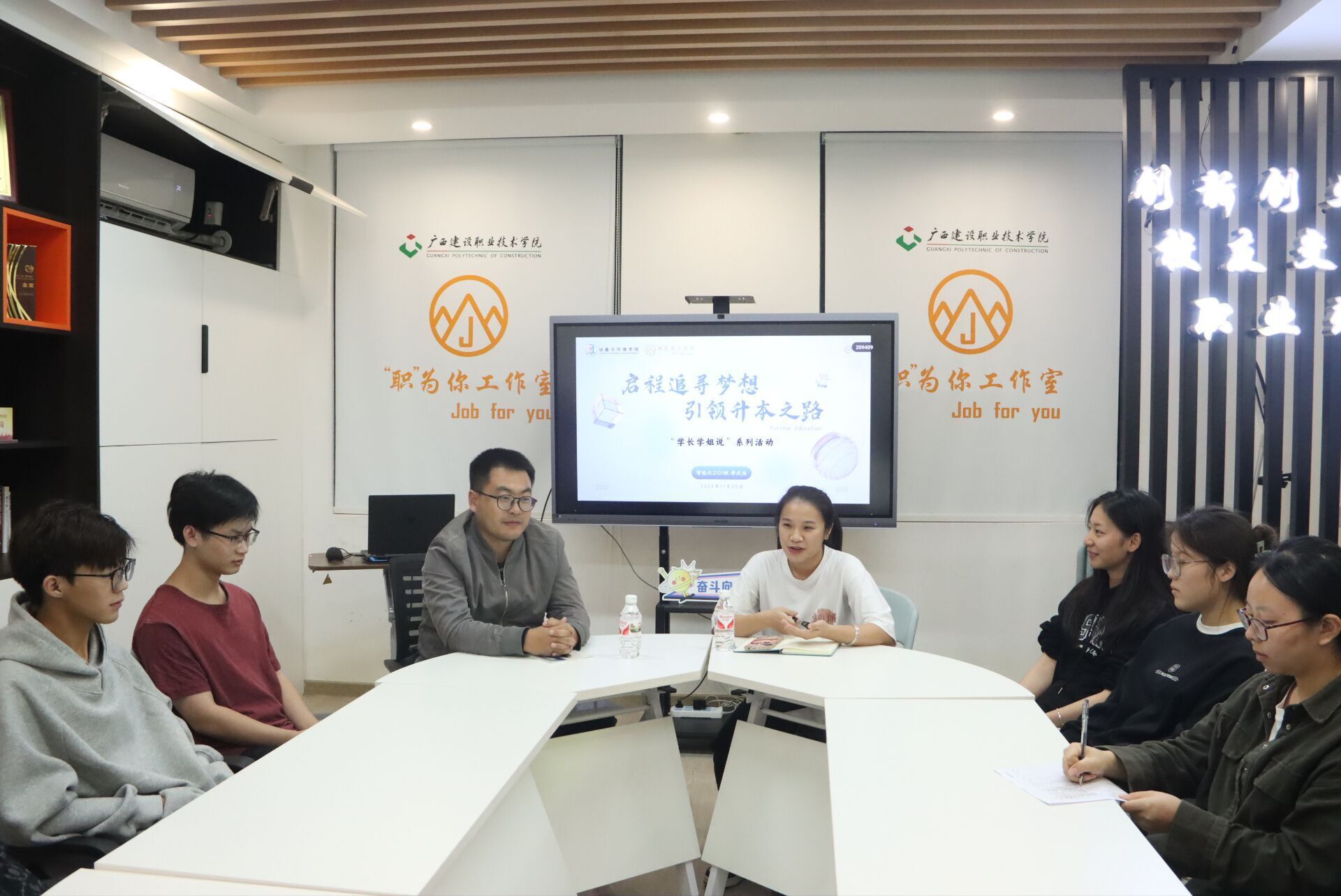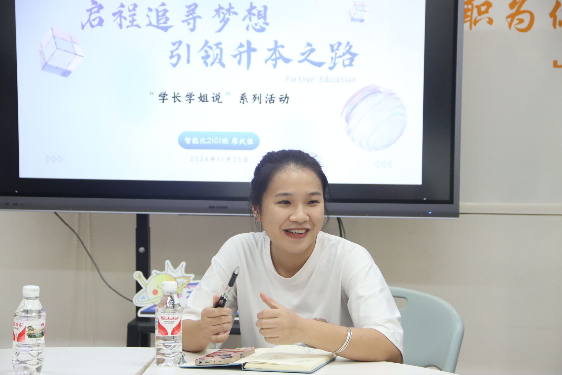 伟德国际1946源于英国设备与环境学院11月26日讯(文/尹显洋 贤冰冰 图/农静芳)为鼓励有升学意愿的学生勇敢地踏上提升学历的旅程,激发他们内心为梦想拼搏的动力与决心,实现学历进阶与个人成长。伟德国际官网“职”为你工作室于11月25日开展“学长学姐说”系列活动之“启程追寻梦想,引领升本之路”主题交流会。智能化2101班的廖武佳学姐作为本次活动的分享交流嘉宾,我院二十余名学生积极参与。
