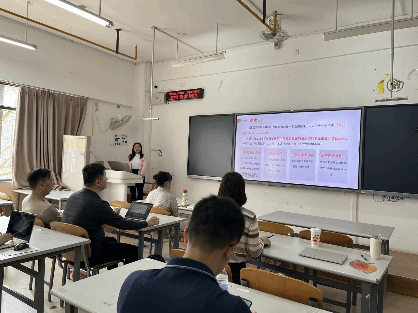 在教学研讨环节,廖路花老师率先登场,围绕《建筑消防救援》课程展开说课。她从课程目标、教学内容、教学方法等多方面进行阐述,强调消防救援在建筑安全中的关键作用。随后,通过多媒体展示,生动呈现了消防救援设备、救援流程等核心知识点,让在场教师对课程内容有了更直观地认识。